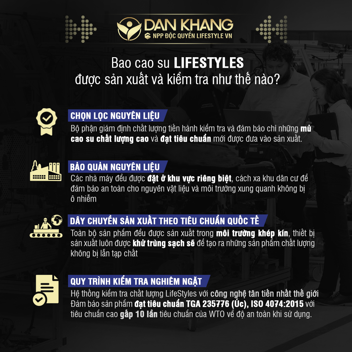 Toàn bộ sản phẩm LifeStyles được sản xuất đạt tiêu chuẩn ISO 4074 – 2015. Sản phẩm được kiểm tra tĩnh điện 100% trước khi bán ra thị trường.