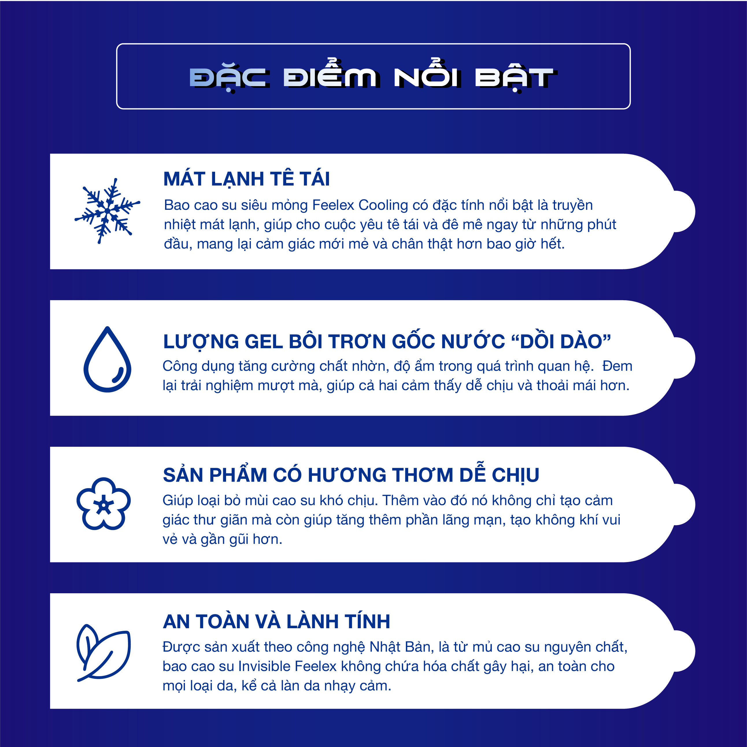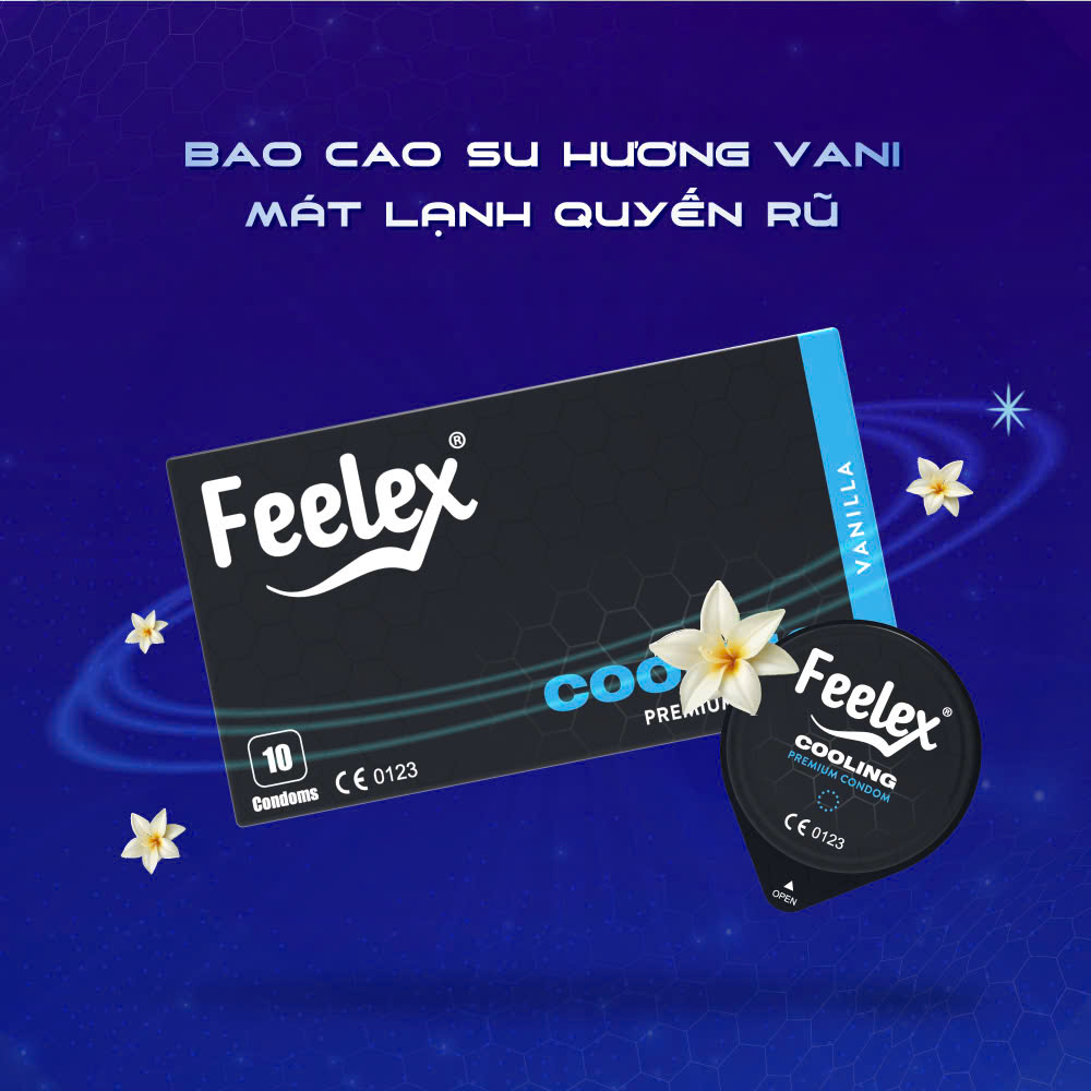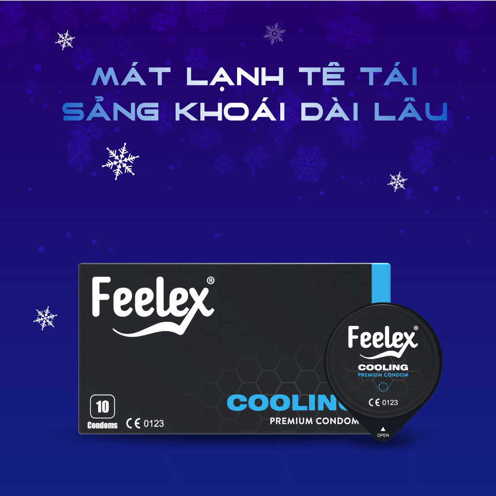 - Bao cao su Feelex Cooling với đặc tính nổi bật là truyền nhiệt mát lạnh, giúp cho cuộc yêu tê tái và đê mê ngay từ những phút đầu, mang lại cuộc yêu mới mẻ và chân thật hơn bao giờ hết.