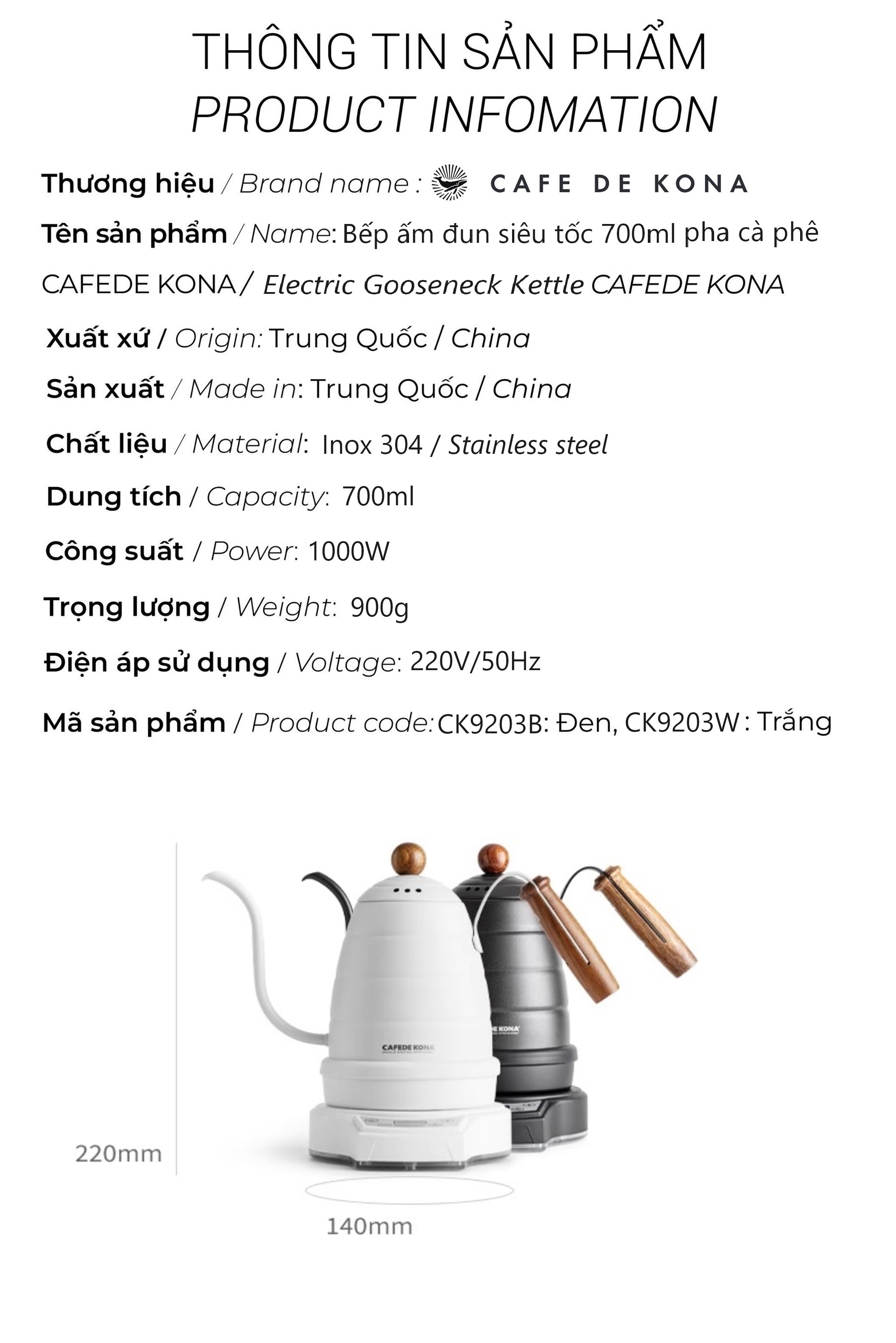 ✨Bếp ấm đun siêu tốc 700ml rót nước pha cà phê CAFE DE KONA