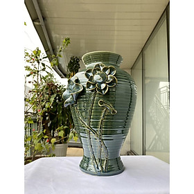 Mua tại TiktokBình hoa Bát Tràng cao cấp, hàng chuẩn loại 1 với kiểu dáng đùi ếch (phần đáy bình nhỏ, phình to ở phần trên và miệng bình) phối với họa tiết hoa đắp nổi cầu kỳ, thực hiện 100% bằng tay trên thân bình. Sản phẩm có nước men căng bóng, sáng loáng, mịn màng với màu xanh ghi nổi bật. Sản phẩm cực kỳ phù hợp với cắm những loại hoa dáng cao, chùm xòe rộng như hoa sen, hồng, ly, tạo nên một sản phẩm sống động, tinh tế. Trưng bày bình hoa trong nhà, trong phòng khách, phòng làm việc, phòng ngủ, văn phòng công ty, cửa hà giúp tạo nên một không gian ấn tượng, thu hút, hấp dẫn, tạo nên những cảm xúc mới lạ cho cả gia chủ lẫn khách đến chơi. Sản phẩm cao 35cm, miệng bình 14cm, vòng bụng bình 68cm