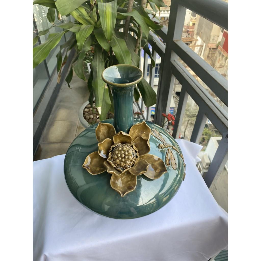 Mua tại TiktokBình hút tài lộc sứ Bát Tràng cao cấp, dáng cổ cao, bụng dẹt, men xanh hỏa biến với nước men căng bóng, sáng mịn cùng với họa tiết hoa sen đắp nổi cầu kỳ, được thực hiện thủ công 100% bởi bàn tay của các nghệ nhân lành nghề. Sản phẩm được trưng bày tại phòng khách, phòng làm việc, văn phòng, cửa hà vừa có tác dụng thu hút tài lộc đến cho chủ nhân vừa có tác dụng trưng các loại hoa theo mùa, giúp trang trí không gian trở nên ấn tượng, thu hút, mới mẻ, hấp dẫn. Bình hút tài lộc cao 35cm, miệng bình 6cm, vòng bụng bình 87cm