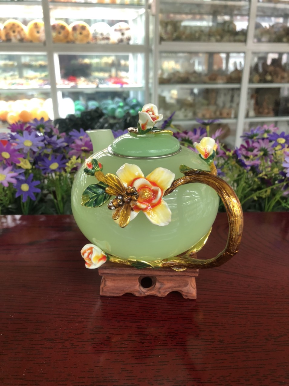 ✨Bộ ấm trà chạm hoa hồng đá ngọc cẩm thạch xanh