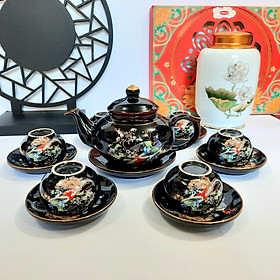 Bộ ấm chén vẽ hoạ tiết cá Ấm cách điệu gốc cây Gốm sứ Bát Tràng cao cấp Dung tích ấm 470ml Bộ ấm chén gồm : 1 ấm , 7 đĩa kê , 6