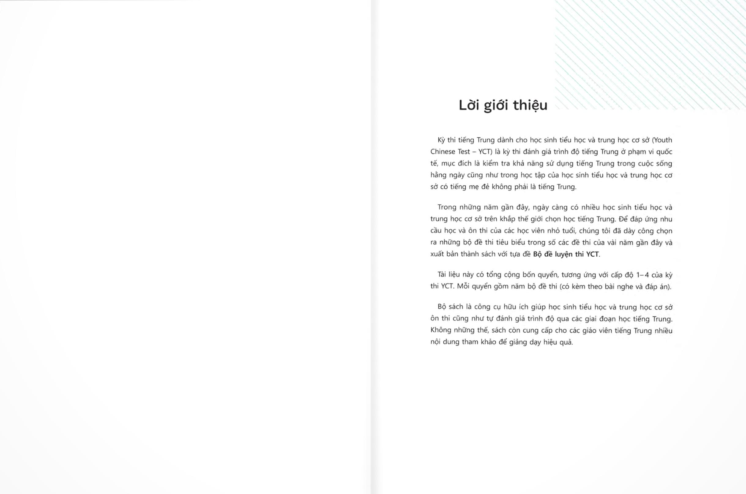 Ngày nay, rất nhiều quốc gia và khu vực trên thế giới có ngôn ngữ mẹ đẻ không phải tiếng Trung đã đưa ngôn ngữ này vào hệ thống giáo dục quốc dân. Vì vậy, số học sinh bậc tiểu học và trung học ở những nơi đó theo học tiếng Trung có xu hướng ngày càng tăng. Để giúp các em làm tốt bài thi YCT (Youth Chinese Test) – bài kiểm tra chuẩn ở cấp độ quốc tế về trình độ tiếng Trung, chúng tôi đã biên soạn sách Bộ đề luyện thi YCT.