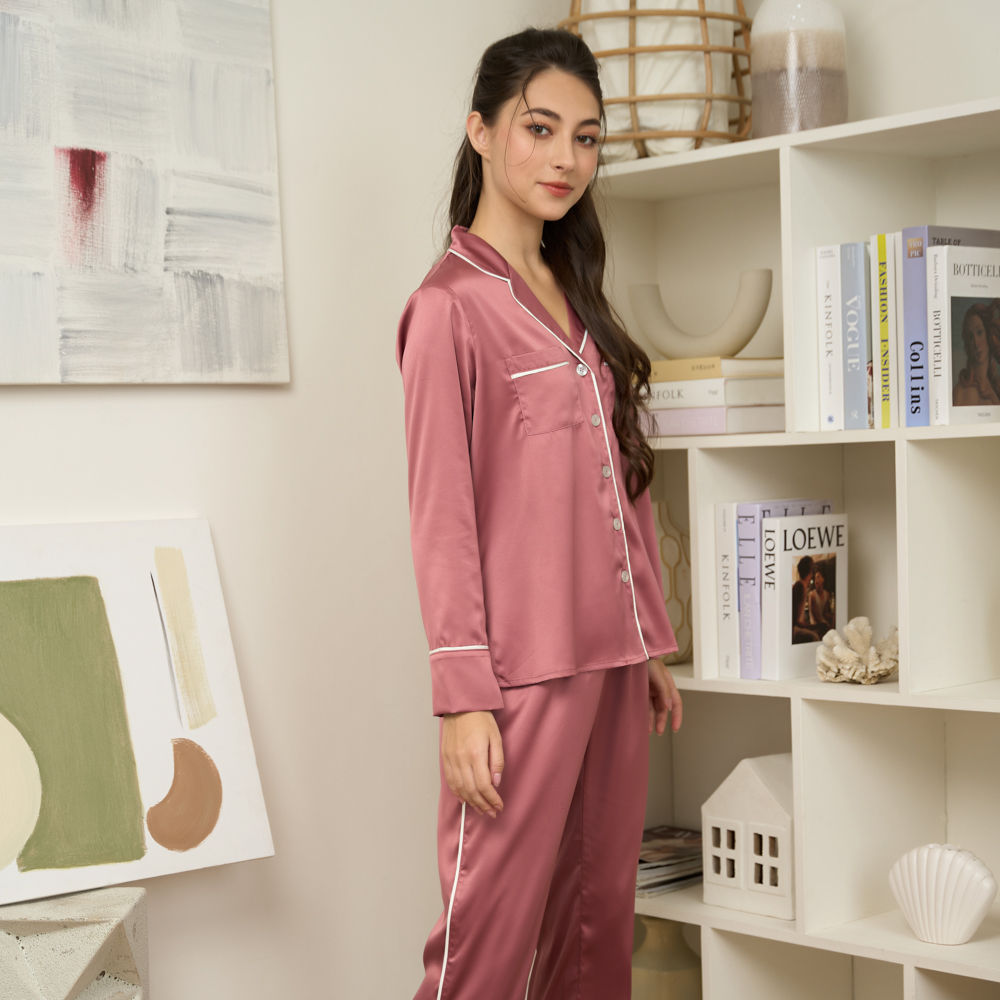 Bộ satin dài, form thoải mái sang trọng, viền mí nổi bật