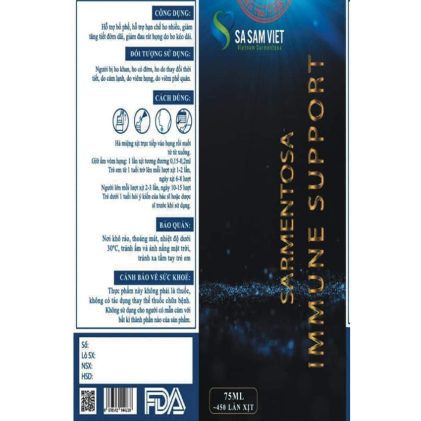 - Không dùng cho người mẫn cảm với bất kỳ thành phần nào của sản phẩm. Bảo quản: Nơi khô ráo, thoáng mát; nhiệt độ dưới 30 độ C, tránh ẩm và ánh nắng mặt trời, tránh xa tầm tay trẻ em. SỰ ĐỘC ĐÁO KHÁC BIỆT CỦA BỔ PHẾ HÓA ĐỜM IMMUNE SUPPORT SARMENTOSA CHÍNH LÀ: Phát huy tác dụng của 3 hợp chất Saponin, Polyphenol, Muối vô cơ cực kỳ cao trong Sa Sâm Việt để thanh lọc cơ thể, làm cho tế bào khoẻ mạnh phát triển. Nâng cao thể trạng sau đó tận dụng chất dẫn hết sức tuyệt vời của muối vô cơ tạo thành các điện tích trên các màng tế bào, cho phép truyền các xung thần kinh đưa dược liệu vào cơ thể một cách tối ưu nhất, phát huy hết tác dụng mang lại hiệu quả cao nhất trong hỗ trợ thanh lọc cơ thể, giúp hỗ trợ bổ phế, hóa đờm; giúp giảm ho gió, ho khan, ho có đờm, ho lâu ngày. SA SÂM VIỆT - SÂM CỦA NGƯỜI VIỆT Là một đề tài nghiên cứu khoa học duy nhất chuyên sâu duy nhất tại Việt Nam và trên thế giới hiện nay. Hàm lượng Saponin cao hơn rất nhiều lần các loài sâm hiện nay: 10.8% – 12.54% Chất chống Oxy hoá Polyphenol 290.9 mg/g cao hơn rất nhiều 100 loài dược liệu và rau củ quả được thế giới công nhận có hàm lượng chất chống Oxy hoá cao nhất thế giới. Muối vô cơ 135.9 mg/g , đây là một loại muối hoàn toàn thiên nhiên được chuyển hoá từ thực vật mà trên thế giới hiện nay cực kỳ hiếm. SAPONIN Saponin sức khỏe cho tim mạch. Nhờ khả năng giảm cholesterol và chất béo tích tụ bám mảng trên thành mạch máu, chống xơ vữa động mạch và các rối loạn khác, Saponin ức chế sự giải phóng lipase, một loại enzyme phá vỡ chất béo trong chế độ ăn uống. Nhờ đó, cơ thể hấp thụ ít chất béo từ thức ăn, Saponin cũng có thể ức chế sự hình thành mô mỡ và ức chế sự thèm ăn, điều này giúp tăng cường hơn nữa hành động có lợi của chúng đối với trọng lượng cơ thể kiểm soát cân nặng ở mức vừa phải. Do đặc tính hạ đường huyết của chúng, chúng giữ cho lượng đường trong máu của cơ thể trong giới hạn bình thường và ngăn ngừa đột biến insulin. Saponin giúp tăng cường hệ thống miễn dịch của cơ thể, kháng khuẩn, bảo vệ cơ thể chống lại nấm, vi khuẩn và virus. Cải thiện chức năng miễn dịch bằng cách kích thích sản xuất tế bào T (Tế bào T, hoặc tế bào lympho T, là một loại tế bào lympho (một phân lớp của bạch cầu) đóng một vai trò trung tâm trong miễn dịch qua trung gian tế bào). Chống oxy hóa và làm giảm căng thẳng, giảm nguy cơ ung thư, gây chết tế bào ung thư, chống lại những tổn thương gốc tự do, có lợi cho các chức năng tinh thần, cải thiện trí nhớ cho người mắc bệnh Alzheimer. Cải thiện các triệu chứng rối loạn cương dương bằng cách giảm căng thẳng oxy hóa trong các mô và tăng cường lưu lượng máu trong cơ của bộ phận sinh dục. POLYPHENOL Polyphenols tồn tại chủ yếu trong tự nhiên, có thể tổng hợp hoặc bán tổng hợp nhưng tính chất sẽ không bằng được với polyphenol tự nhiên. Ở thực vật có một cơ chế giúp bảo vệ thực vật chống lại sự phá hoại của tia cực tím và xâm nhập của mầm bệnh, đó là sản sinh ra các polyphenol thực hiện chức năng như người bảo vệ” và tái tạo cấu trúc tế bào. Sa Sâm Việt được trồng trên cát biển, trong suốt quá trình sinh trưởng và tồn tại, để chống lại ánh nắng và tia cực tím trên vùng biển khắc nghiệt. Sa Sâm Việt đã tự sản sinh ra Polyphenol để tự kháng với môi trường, đặc biệt là tia cực tím UV. Vì vậy trong Sa Sâm Việt hàm lượng Polyphenol lên đến 290.9mg/g, cao hơn rất nhiều lần 100 loài dược liệu rau củ quả được thế giới công nhận có hàm lượng chất chống Oxy hoá cao nhất thế giới. Lợi ích của polyphenol với sức khỏe ! Polyphenol có tác dụng khử các gốc tự do, chống oxi hóa, ngăn chặn quá trình lão hoá cơ thể con người. hạn chế sự phát triển khối u, ung thư ở đường ruột. ngăn chặn và kiểm soát chứng béo phì. Kháng viêm và chống ung thư, có khả năng ức chế sự tăng trưởng của tế bào ung thư gan, ngăn ngừa bệnh viêm gan mãn tí giúp động mạch co giãn để duy trì lưu lượng máu và giữ cho động mạch không bị xơ vữa. chống lại các tổn thương của tế bào. Đặc biệt polyphenol còn có chức năng quang trọng thực hiện chức năng thải độc, bảo vệ tế bào. Polyphenol xuất hiện nhiều ở rau củ quả và các loại hạt, sở dĩ ăn nhiều rau xanh và trái cây giúp chúng ta tươi trẻ hơn là nhờ vi chất này. Các hợp chất polyphenols có khả năng làm chậm lại quá trình oxy hóa nhờ vào sự kết hợp với các enzyme có trong thực vật ổn định đường huyết đặc biệt là tiểu đường týp 2 hổ trợ bệnh tim mạch, bệnh thần kinh và bệnh võng mạ MUỐI VÔ CƠ Hiện nay Kali, Natri, Magie, Canxi (Muối vô cơ) tích lũy trong các tế bào thực vật. Hiện nay do canh tác nông nghiệp với sản lượng lớn đã làm cạn kiệt nguồn dinh dưỡng này nhanh chóng, vì vậy trong canh tác nông nghiệp trên t