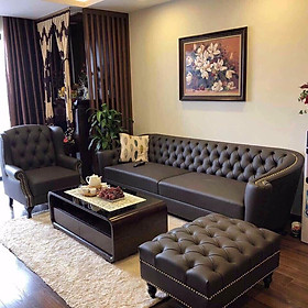 Bộ sofa phong cách tân cổ điển - 01 Ghế văng kích thước 2,4m - 01 Ghế đơn 80cm - 01 Đôn Thông minh kích thước 60x80cm - Bàn trà gỗ sồi kích thước 60x120x35cm