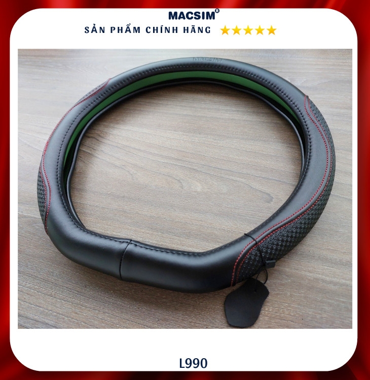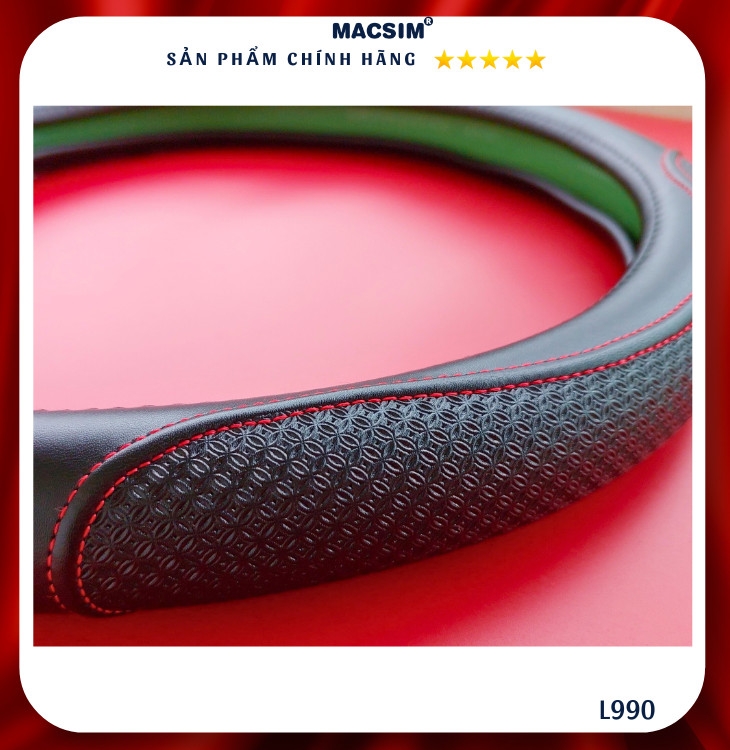 Bọc vô lăng cao cấp Macsim mã Dcut mã L990 màu đen chỉ đỏ chất liệu da thật 100%,- chất liệu da thật 100%, lõi ruột vô lăng được sản xuất từ silicon cao cấp