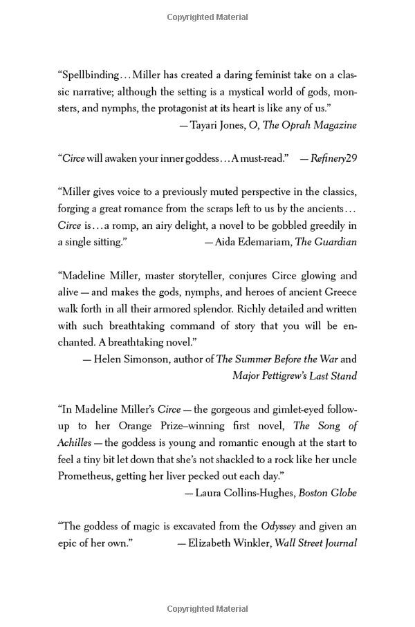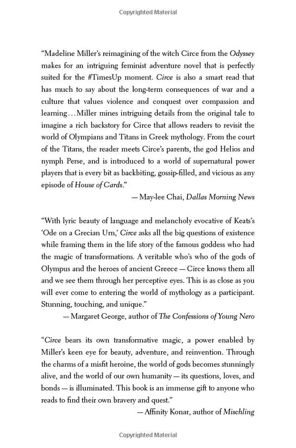 Scorned, rejected and at last exiled from her father's house for her dark gifts, Circe arrives on the remote island of Aiaia with nothing but her wits and magic to help her. But there is danger for a solitary woman in the world, and Circe's independence and strange powers draw the wrath of men and gods alike. To protect what she holds dear, Circe must decide whether she belongs with the deities she is born from, or the mortals she has come to love.
