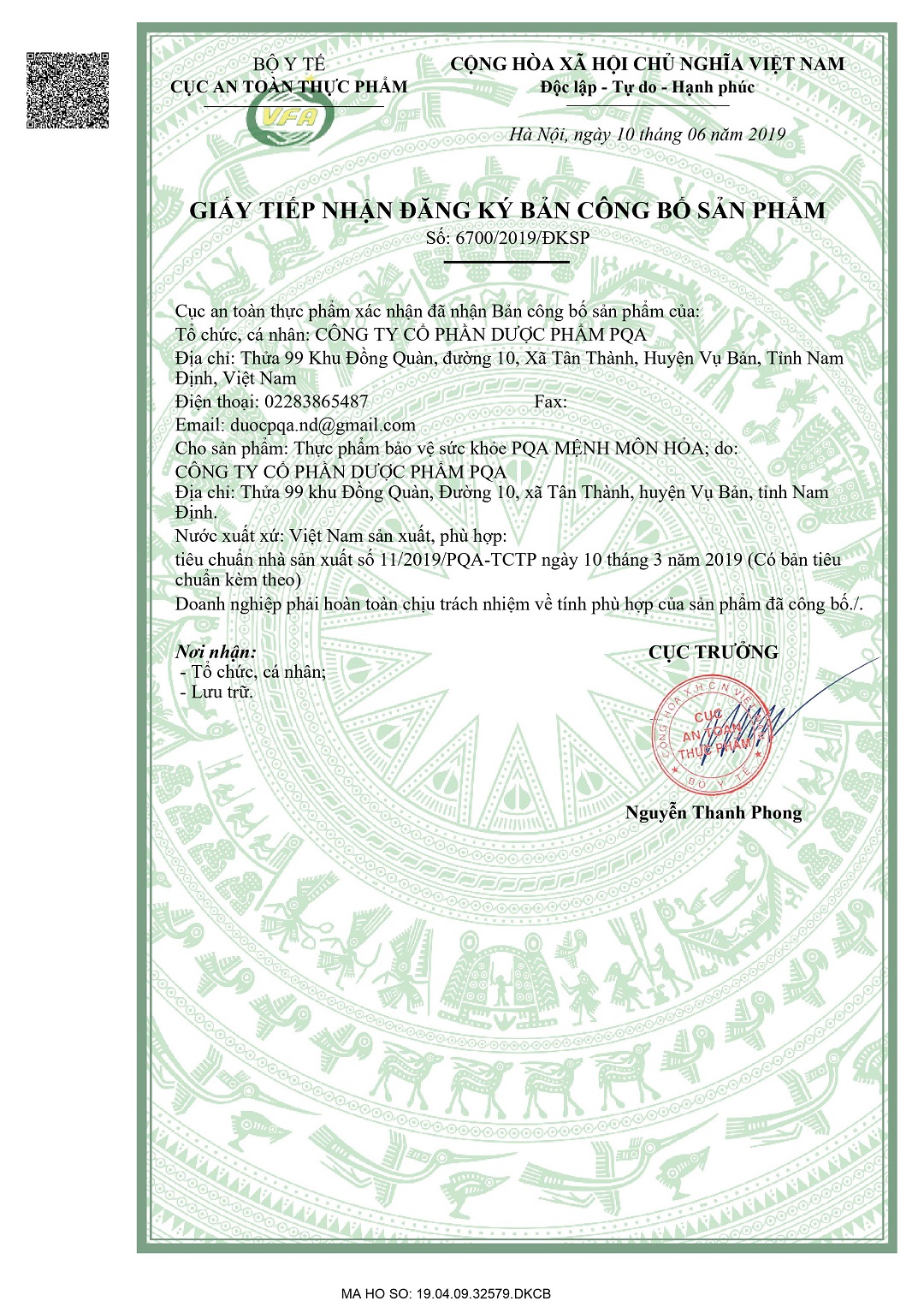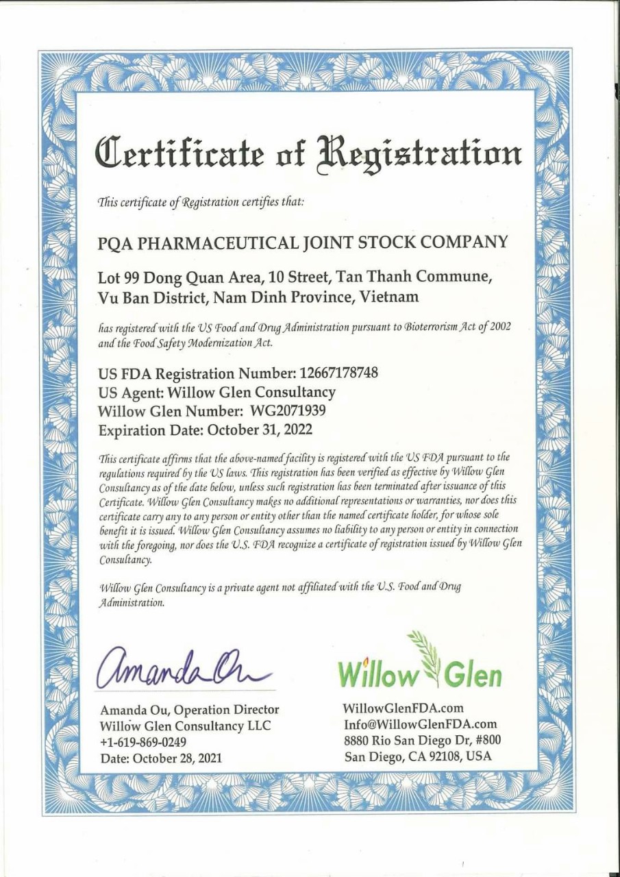 - Địa chỉ sản xuất: Công ty Cổ phần Dược phẩm PQA. Thửa 99, Khu Đồng Quàn, Xã Tân Thành, Huyện Vụ Bản, Tỉnh Nam Định. THÀNH PHẦN: