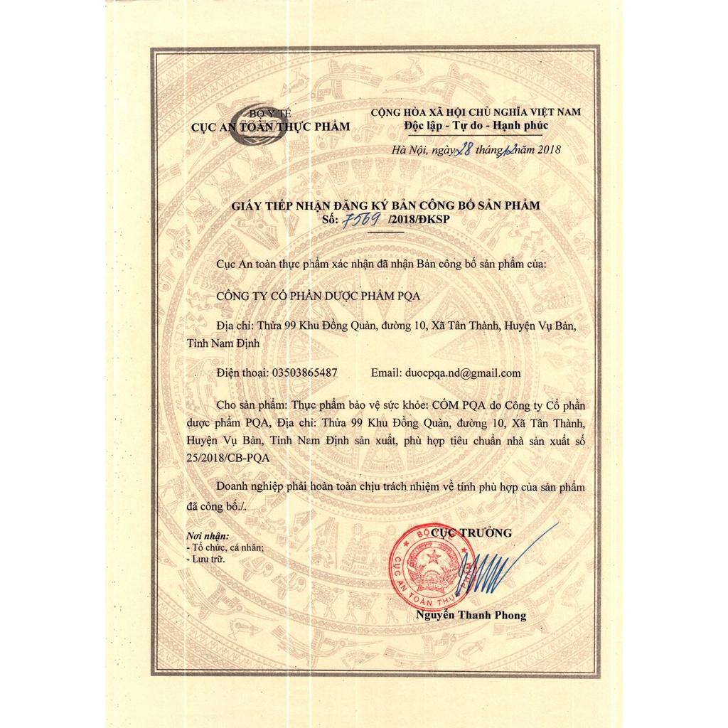 - Địa chỉ sản xuất: Công ty Cổ phần Dược phẩm PQA. Thửa 99, Khu Đồng Quàn, Xã Tân Thành, Huyện Vụ Bản, Tỉnh Nam Định. THÀNH PHẦN: