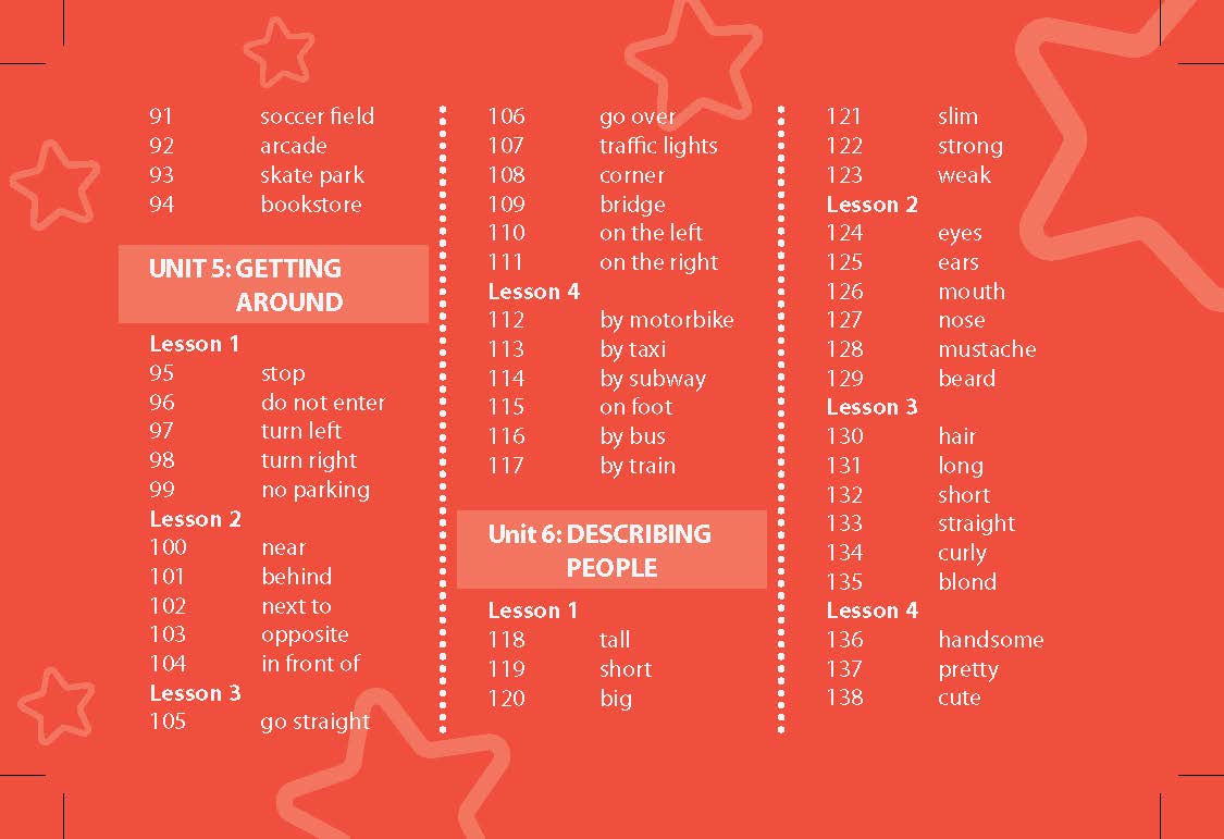 Sách: Learning English 4 - Dành Cho Học Sinh Lớp 4 NỘI DUNG VÀ CẤU TRÚC CỦA QUYỂN SÁCH : Bảng mục lục: Chỉ rõ các mục tiêu chính và trọng tâm của mỗi bài