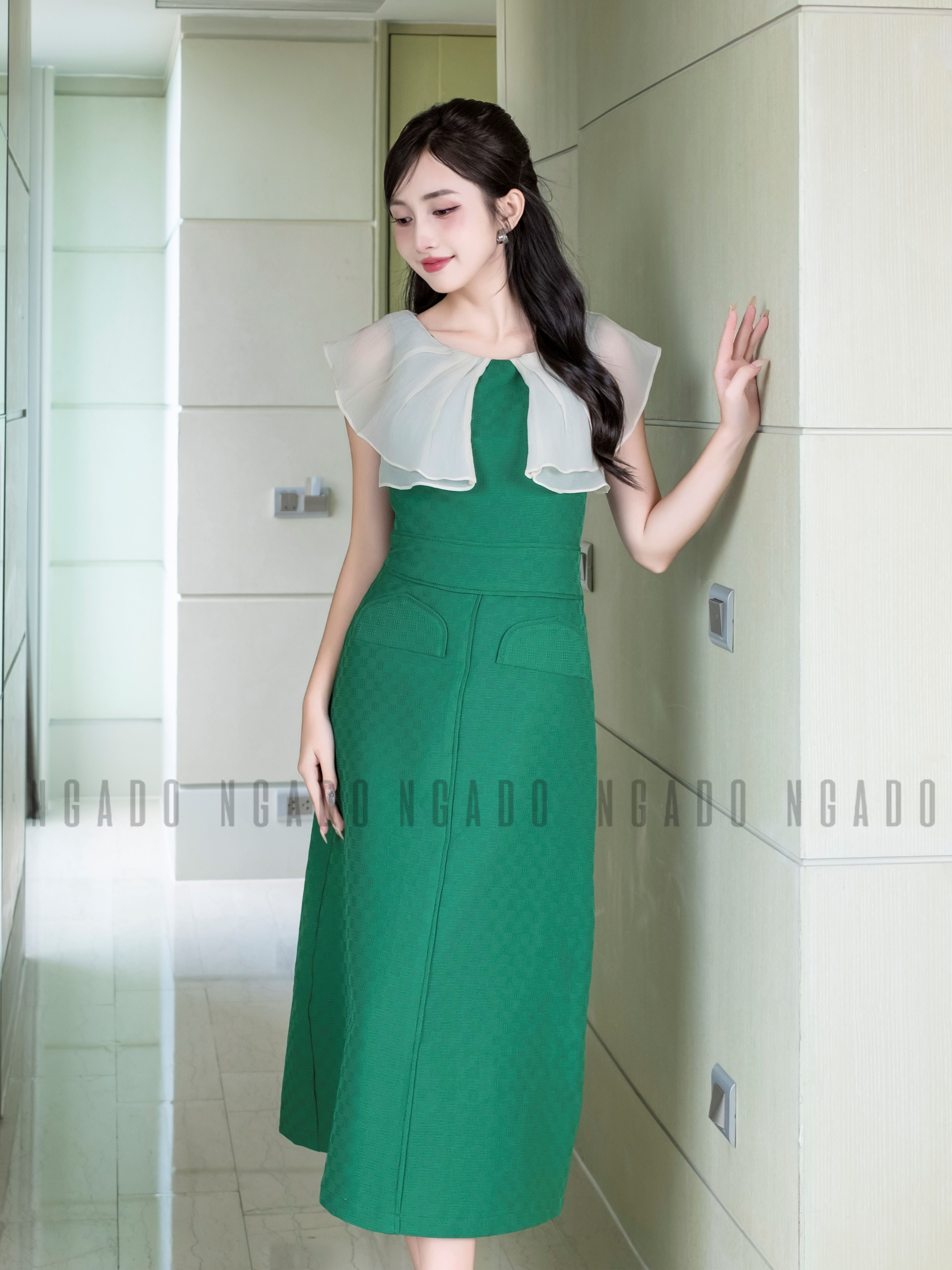 ✨Đầm xanh phối voan kem NGADO , Đầm dự tiệc , Đầm dạo phố