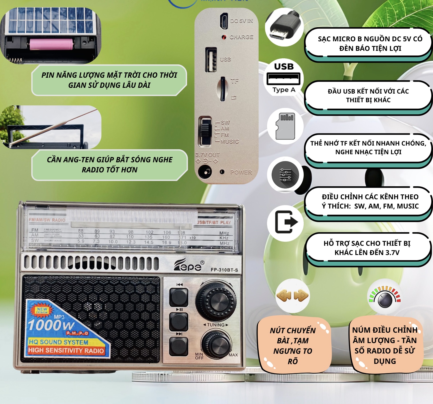 - 3 Băng FM , AM , SW - Bluetooth 5.0 , Phát nhạc từ USB hoặc thẻ nhớ TF Card - Sử dụng điện trực tiếp 220V hoặc pin sạc dung lượng lớn kèm