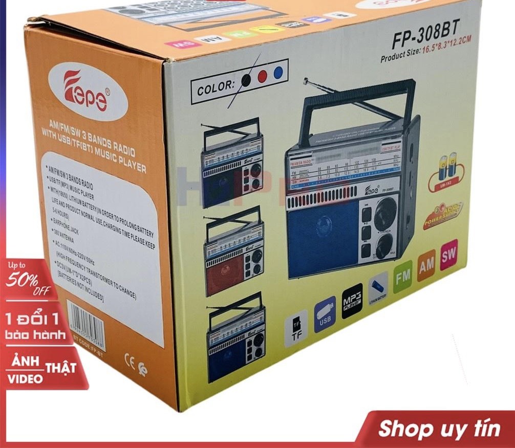 - 3 Băng FM , AM , SW - Bluetooth 5.0 , Phát nhạc từ USB hoặc thẻ nhớ TF Card - Sử dụng điện trực tiếp AC 220-240V/50Hz hoặc pin sạc liền máy, DC