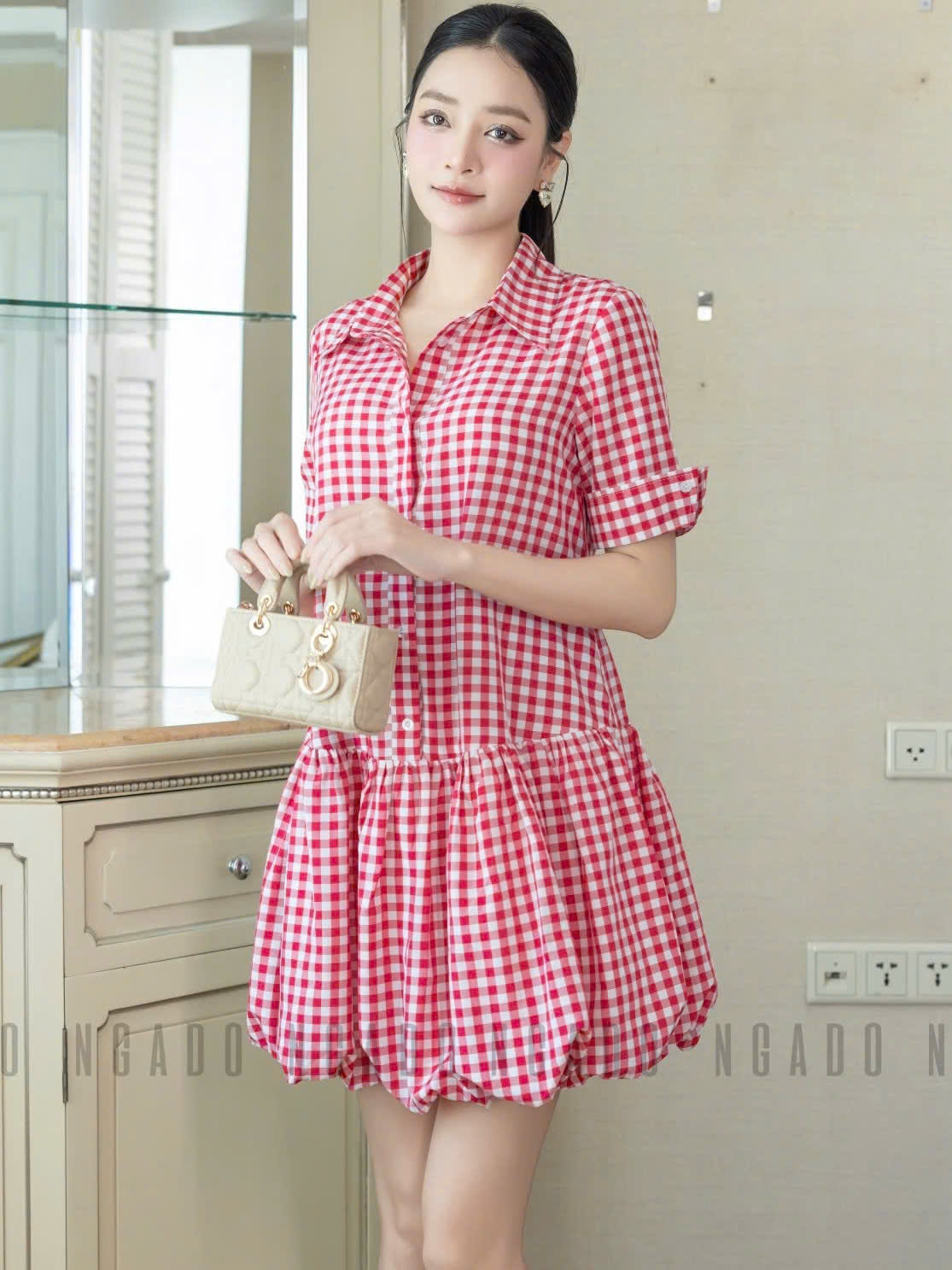 Tên sản phẩm: Đầm babydoll caro đỏ cổ sơ mi