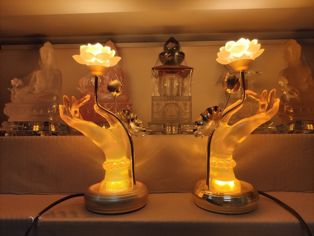 Cặp đèn thờ tay Phật cầm hoa sen với chất liệu giả lưu ly đúc trong và sáng tinh tế, kết hợp với chất liệu đồng và đá lưu ly nguyên chất làm đèn sáng