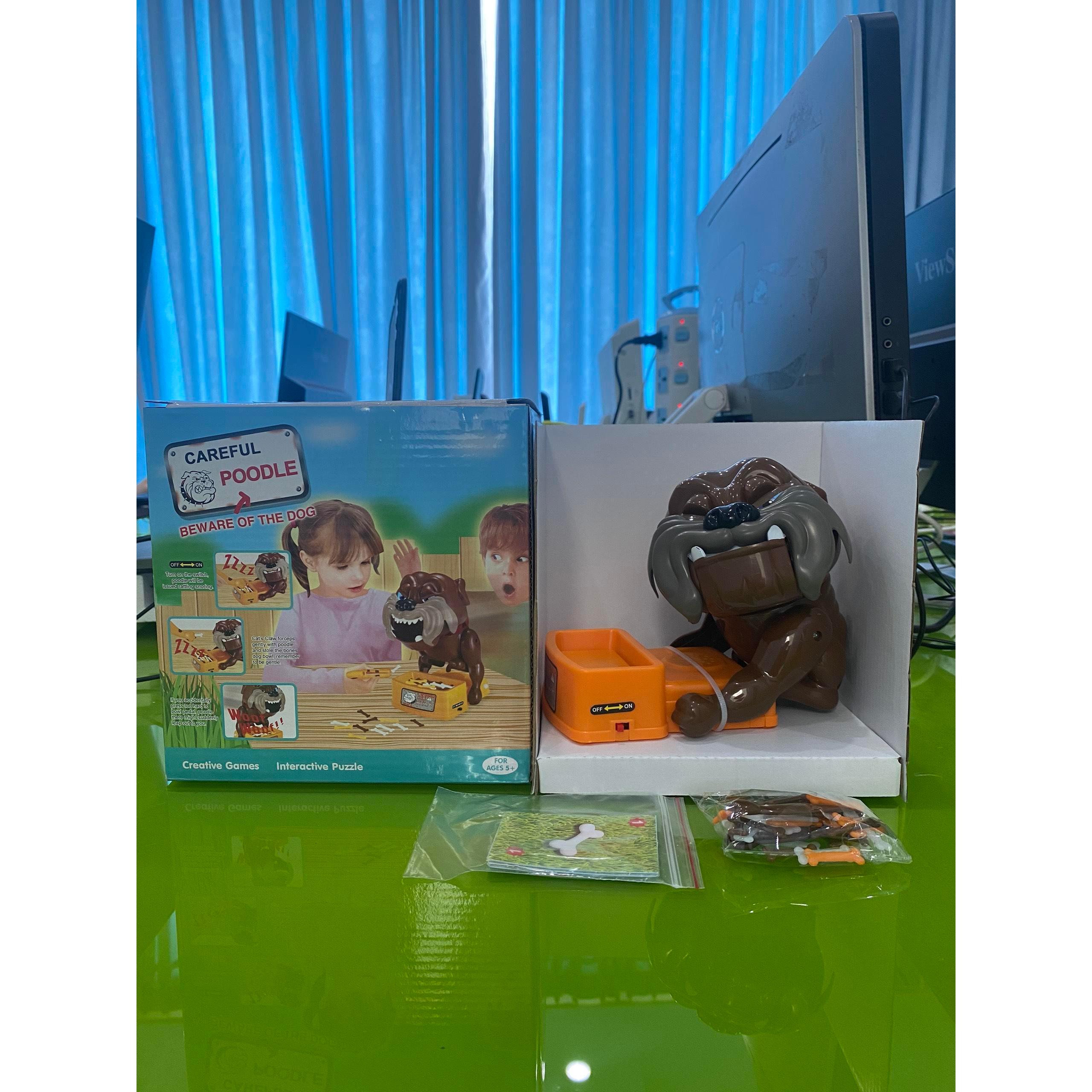 Đồ chơi gồm: 1 con Bulldog, xương với 4 màu xanh trắng vàng và đỏ, 1 bộ thẻ rút xương, 1 khay đựng xương, 1 cái gắp xương.