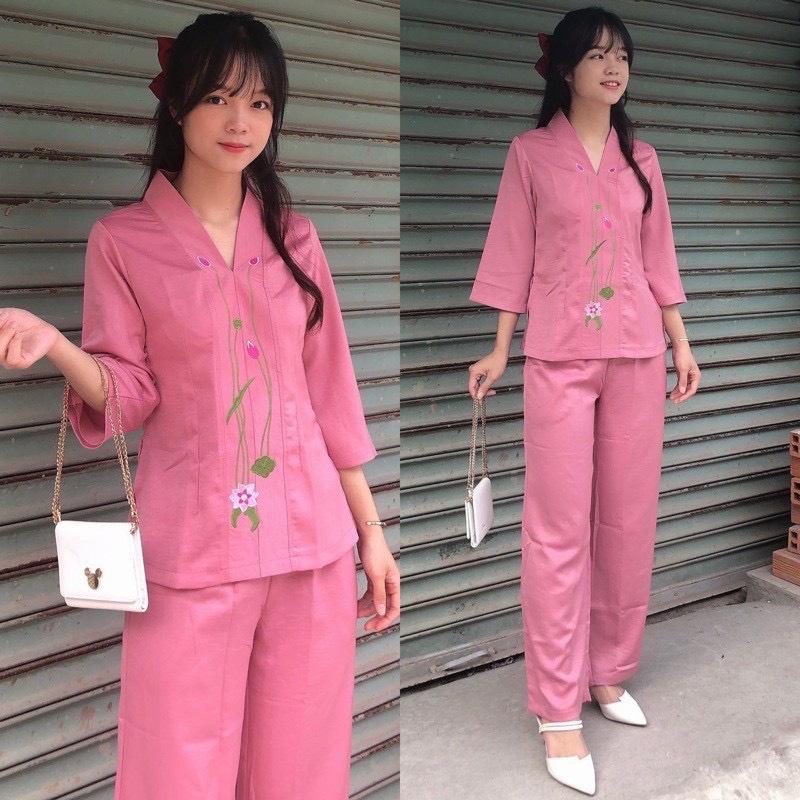 Mẫu pháp phục nữ - quần áo Phật tử đi chùa, đồ lam chất kate lụa mềm có co giãn Sen Hồng 0898553583