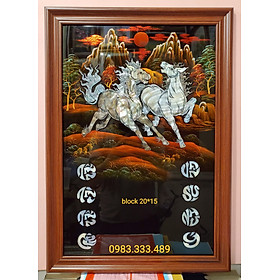 Đốc lịch sơn mài khảm ốc -Song mã Chất liệu : ván gỗ 10mm, sơn mài, khảm ốc Tranh hoàn toàn được làm thủ công, bền đẹp cùng thời gian Khung tranh vân gỗ composite