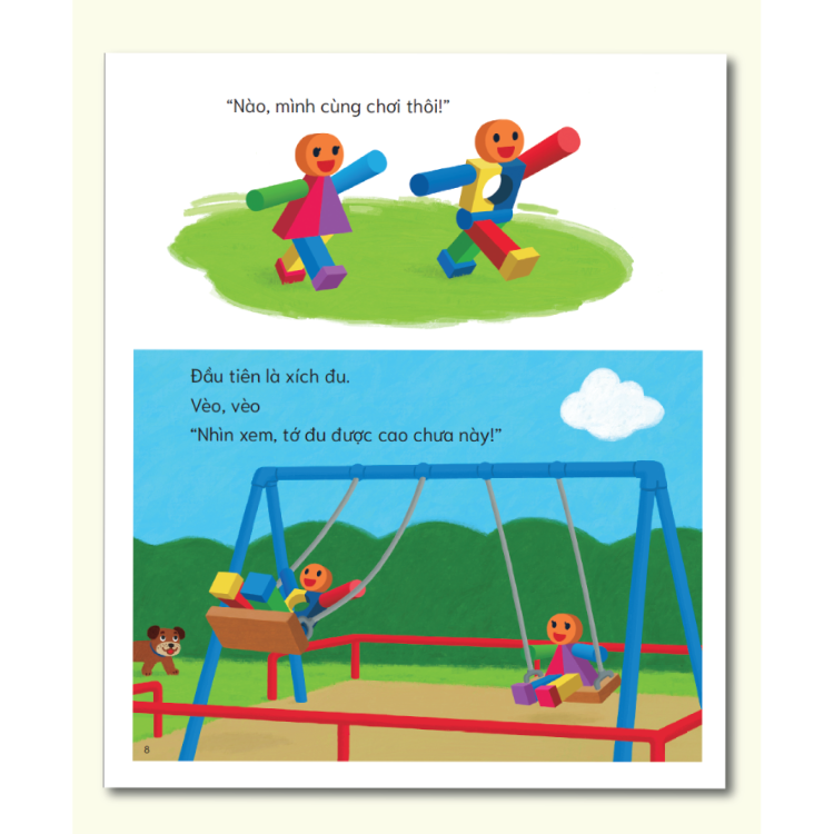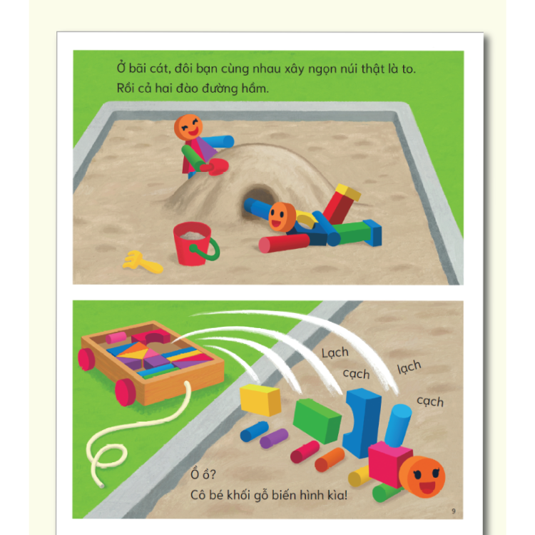 • Đôi bạn khối gỗ cùng nhau ra công viên chơi. Ở đây có bao nhiêu là chỗ để thỏa sức nô đùa như: xích đu, bập bênh, cầu trượt, bãi cát… Nhưng bạn cún con bỗng nhiên xuất hiện và tranh giành và không để cho đôi bạn khối gỗ tham gia các trò chơi trong công viên.