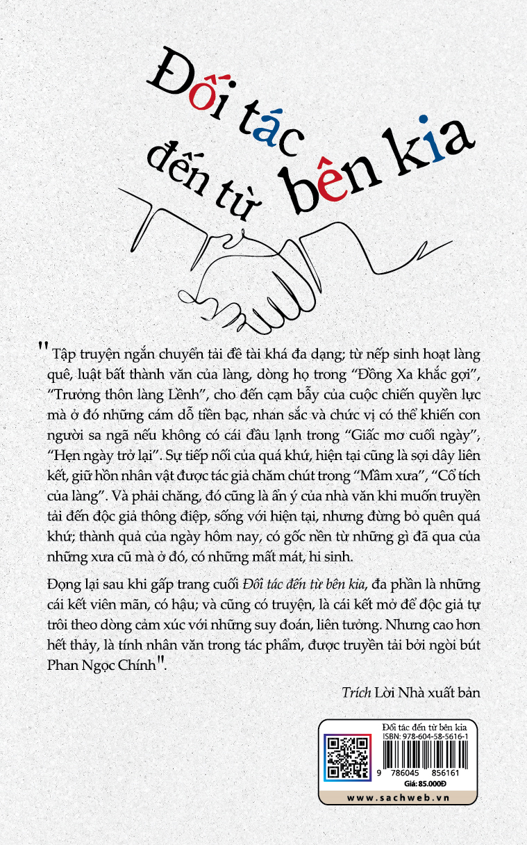 ĐỐI TÁC ĐẾN TỪ BÊN KIATác giả: Phan Ngọc ChínhKhổ sách:  13x20 cmSố trang: 228 trangISBN: 9786045856161Năm xuất bản: 2023Giá bìa: 85,000đNội dung:"Tập truyện ngắn chuyển tải đề tài khá đa dạ...