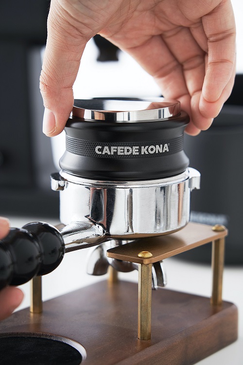 GIÁ ĐỠ TAMPER BẰNG GỖ TỰ NHIÊN PHA CÀ PHÊ MÁY ESPRESSO CAFE DE KONA Khối gỗ được làm bằng 2 loại gỗ: gỗ óc chó đen và gỗ giẻ gai châu âu.