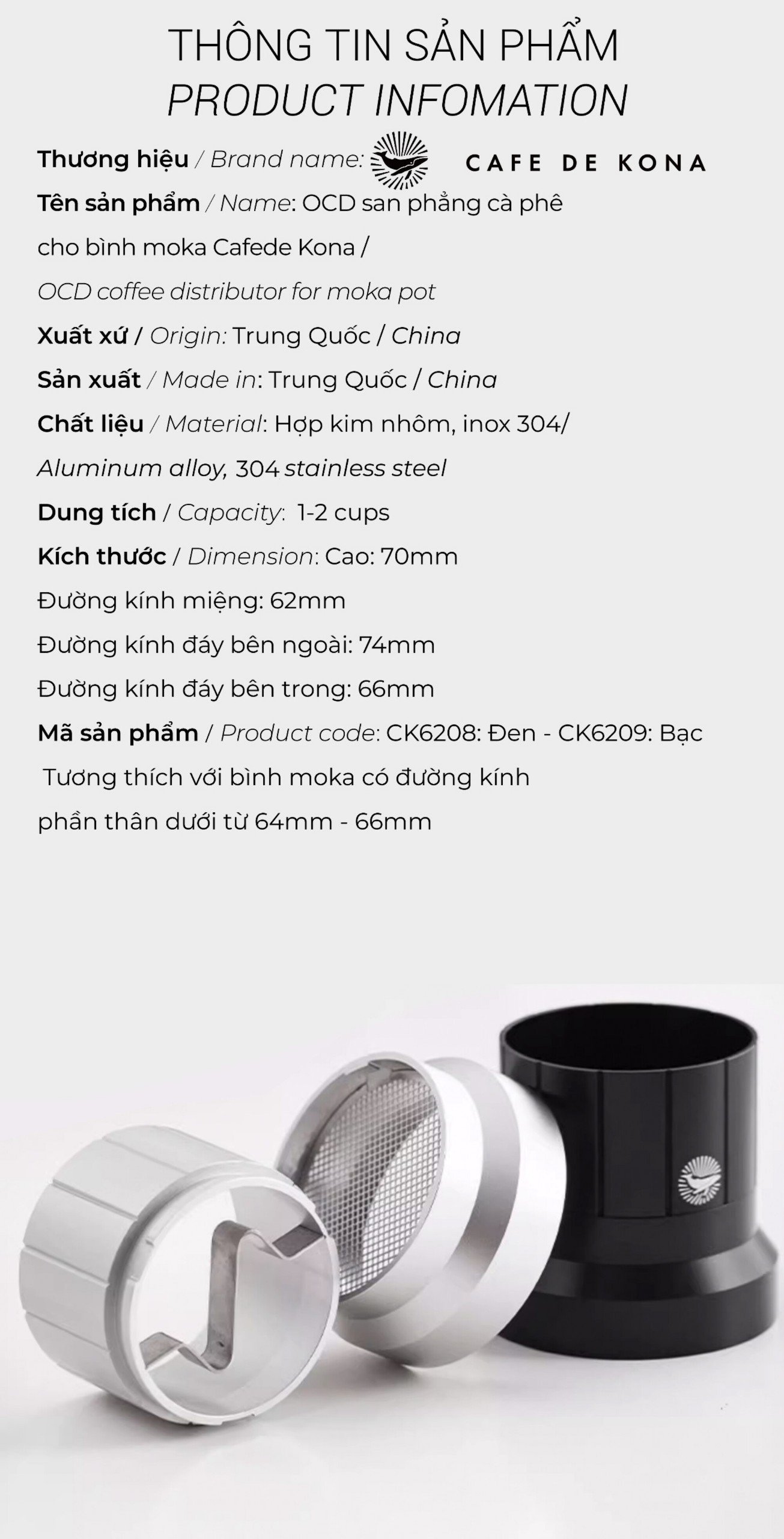 Mua tại TiktokOCD SAN PHẲNG CÀ PHÊ CHO BÌNH MOKA 2 CUP CAFEDE KONA Vòng đong cà phê pha Moka được thiết kế với hai chức năng chính: Ngăn bột cà phê không bị đổ ra ngoài trong quá trình đong cà phê vào phễu đựng Moka. Phân bố bột cà phê đều khắp giỏ lọc. Sản phẩm được làm từ inox 304/hợp kim nhôm . Bạn có thể vệ sinh dễ dàng bằng nước hoặc chổi vệ sinh. Lưu ý: Sản phẩm chỉ tương thích với bình moka có đường kính phần thân dưới từ 64mm-66mm