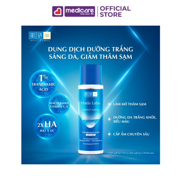 Dung Dịch HADA LABO Dưỡng Sáng Da Giảm Thâm Sạm 170ml là lotion dưỡng da thuộc dòng sản phẩm dưỡng sáng Perfect White mới của thương hiệu Hada Labo, với thành phần 1% T. X. A, Niacinamide, Vitamin C, E và gấp đôi Hyaluronic Acid cùng chiết xuất hạt ý dĩ giúp cấp ẩm chuyên sâu đặc biệt cải thiện các đốm nâu, dưỡng da sáng mịn, đều màu, rạng rỡ, tràn đầy sức sống.