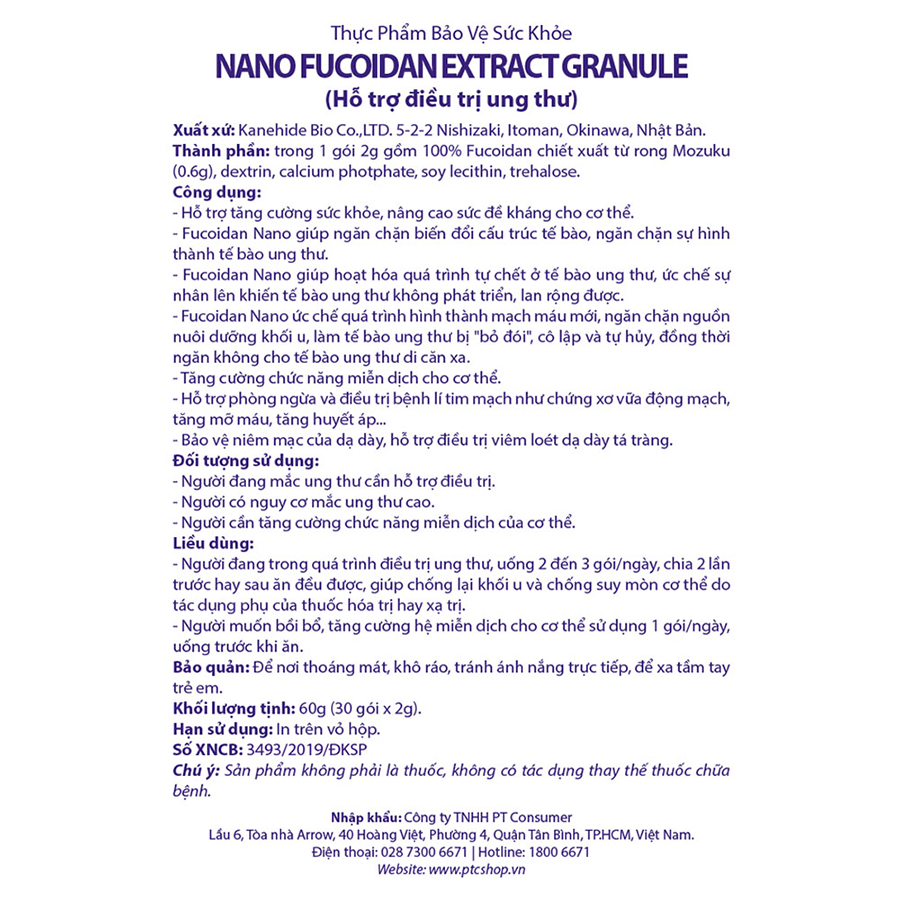 - Hạn sử dụng: 2 năm kể từ ngày sản xuất Nano Fucoidan là sản phẩm phòng và hỗ trợ điều trị ung thư hiệu quả, ứng dụng công nghệ Nano tạo ra các hạt phân tử NANO siêu vi giúp dễ dàng hấp thụ trực tiếp vào tế bào trong thời gian ngắn, Nano Fucoidan mang lại hiệu quả cao trong việc phòng và hỗ trợ điều trị ung thư cao nhất. Đặc biệt là đối với bệnh nhân ung thư giai đoạn muộn. Nano Fucoidan với thành phần chính 100% tinh chất Fucoidan chiết xuất từ rong nâu Mozuku Nhật Bản, có tác dụng vượt trội trong việc phòng ngừa và hỗ trợ điều trị mọi giai đoạn ung thư. Được sản xuất bởi Tập đoàn Kanehide Bio Nhật Bản, chuyên nghiên cứu và sản xuất các sản phẩm có nguồn gốc thiên nhiên tại đảo Okinawa Nhật Bản, Okinawa được biết đến là nơi có dân số sống thọ nhất thế giới, theo nhiều nghiên cứu, người dân trên đảo Okinawa có tuổi thọ cao là nhờ vào chế độ ăn uống, và nguồn thực thẩm sạch và an toàn. Kanehide Bio là tập đoàn đầu tiên áp dụng công nghệ sinh học cao tạo ra các sản phẩm dược phẩm và thực phẩm chức năng thay thế thuốc tại Nhật Bản. Nhà máy đạt chứng nhận JAS, ISO 22000, ISO 9001 HACCP và GMP tại Nhật Bản. Là đơn vị đầu tiên nghiên cứu và chiết suất thành công Fucoidan từ rong nâu Mozuku tại đảo Okinawa Nhật Bản. Hơn thế nữa Kanehide Bio đã ứng dụng thành công công nghệ tạo hạt Nano vào việc sàn xuất Fucoidan, đây là bước đột phá mới giúp hấp thu Fucoidan hiệu quả và nhanh chóng cho bệnh nhân ung thư hiện nay. \ CÔNG DỤNG: