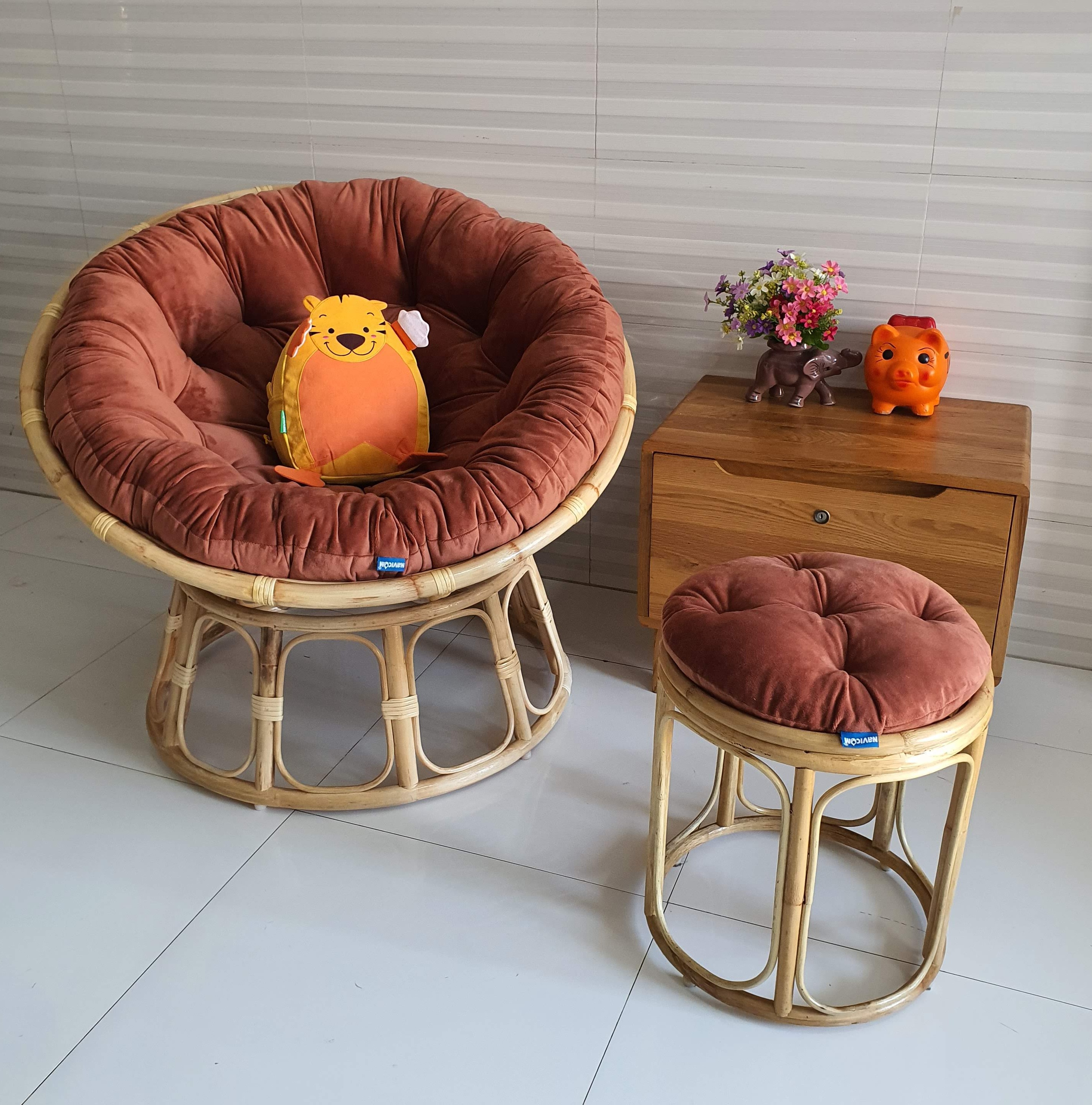 - Kích Thước : D 1m x cao 74cm - Chất liệu : + khung : mây song mật + nệm : gòn bi xuất khẩu bọc vải nhung Ghế thư giãn papasan phù hợp