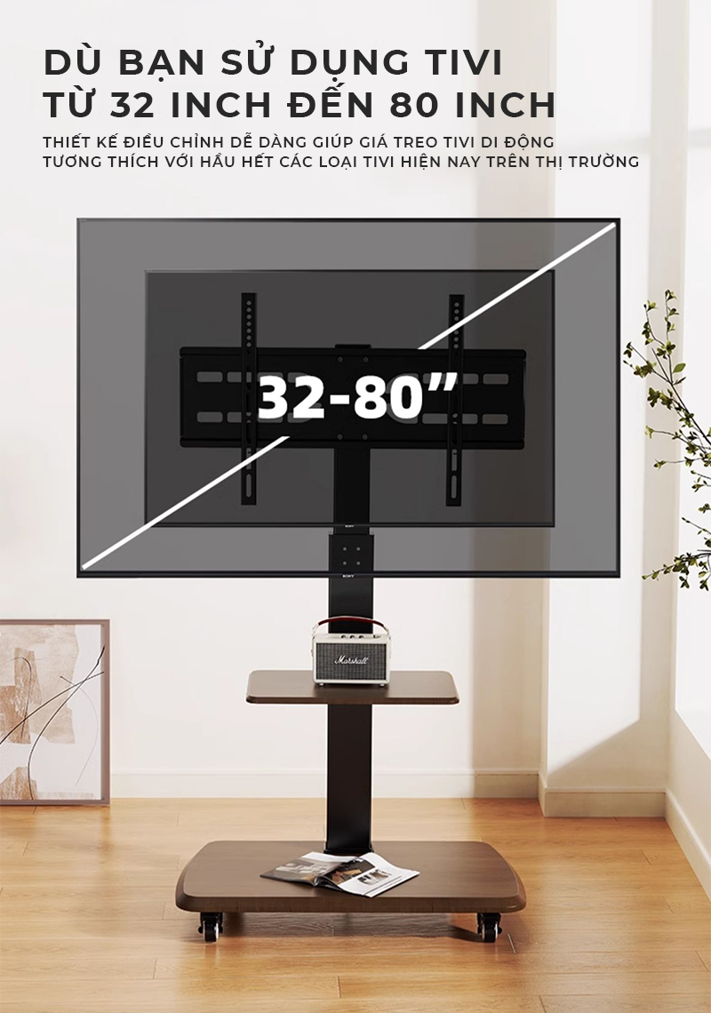 Công năng: Là mẫu giá treo tivi di động kèm kệ để đồ tiện lợi phù hợp nhiều không gian như phòng khách, phòng ngủ, phòng họp, phòng cộng đồng, ...