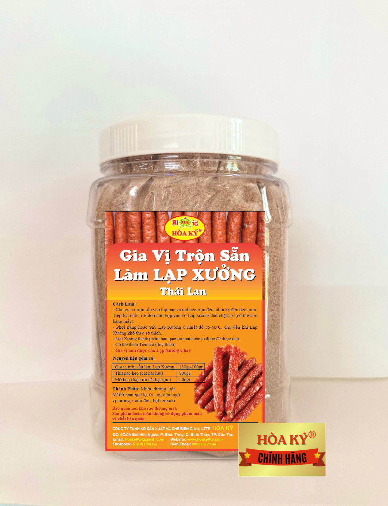 - Gia vị trộn sẵn làm Lạp Xưởng: 150gr- 200gr. -Thịt nạc heo ( cắt hạt lựu ) 800gr -Mỡ heo (luộc rồi cắt hạt lựu )200gr Tiêu ( tuỳ thích) Cách Làm: -Cho gia vị trộn sẵn vào thịt nạc và mỡ heo trộn đều, nhồi kỷ đến dẻo, mịn. Tiếp tục nhồi, rồi dồn hỗn hợp vào vỏ Lạp xưởng thật chặt tay ( có thể làm bằng máy ). -Phơi nắng hoặc Sấy Lạp Xưởng ở nhiệt độ 55-60*c ,cho đến khi Lạp Xưởng khô theo sở thích. -Lạp Xửơng thành phẩm bảo quản tủ mát hoặc tủ đông để dùng dần. Gia Vị làm được cho Lạp Xưởng Chay . Bảo quản nơi khô ráo thoáng mát. Sản phẩm hoàn toàn không sử dụng phẩm màu và chất bảo quản .