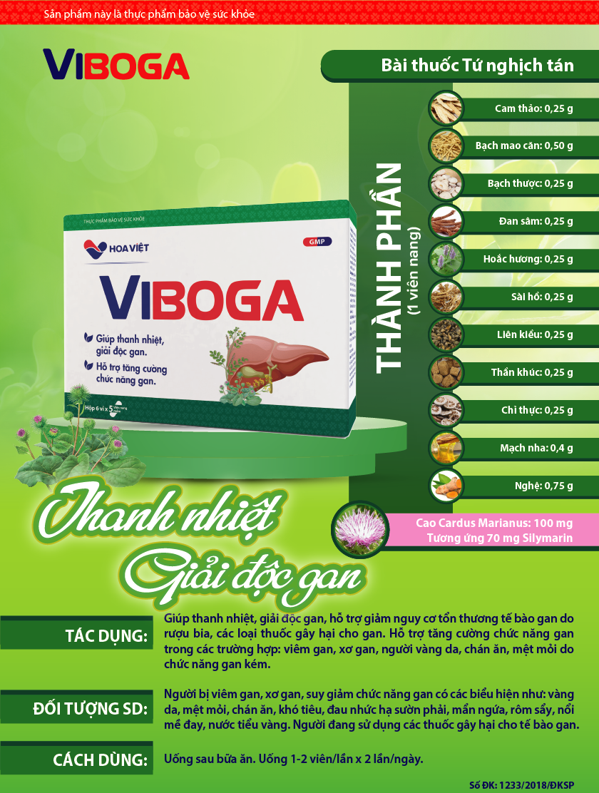 Trà giải độc mát gan Viboga Hoa Việt Hỗ trợ Phòng ngừa Gan 1. THÔNG TIN SẢN PHẨM - Tên sản phẩm: Viên uống giải độc gan Viboga Hoa Việt - Xuất xứ: Việt