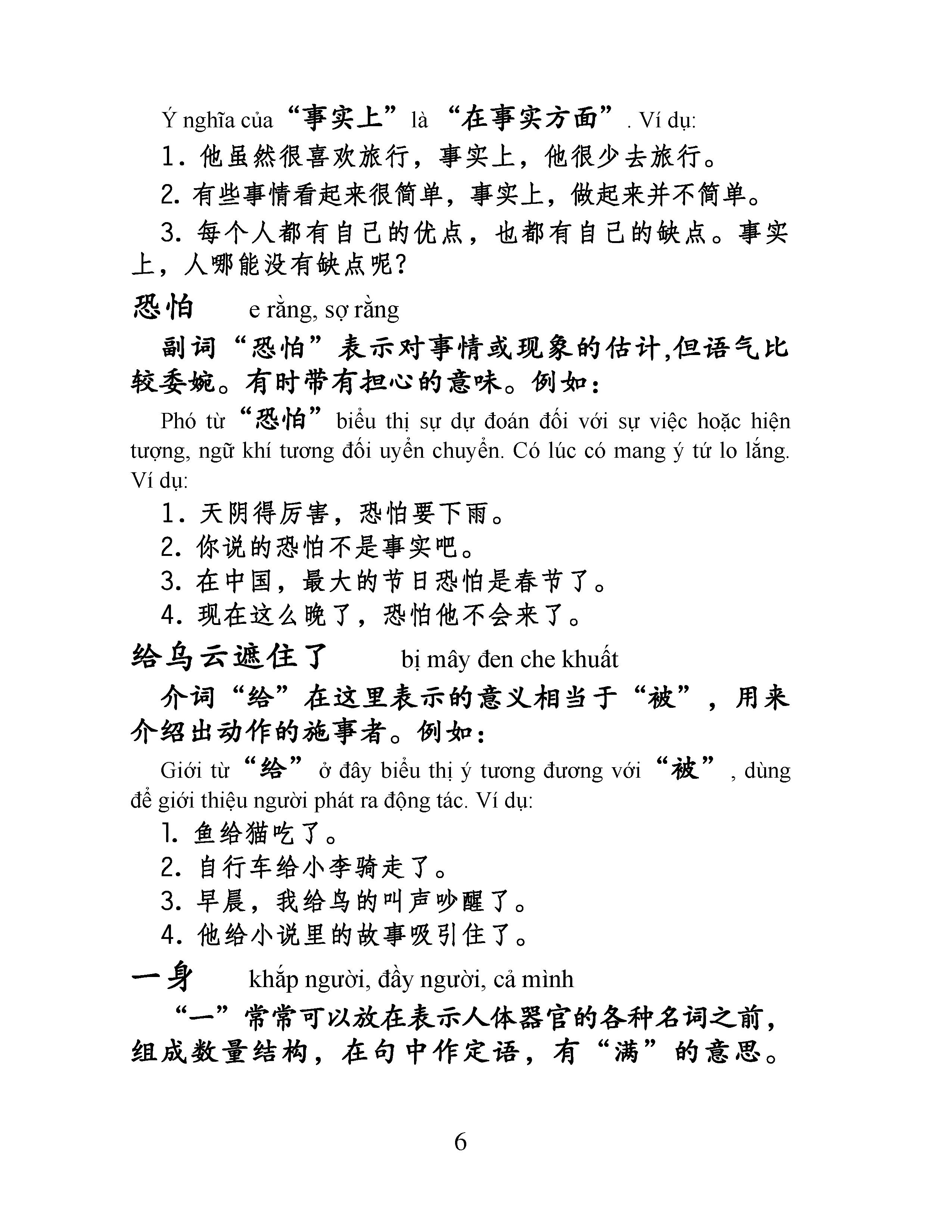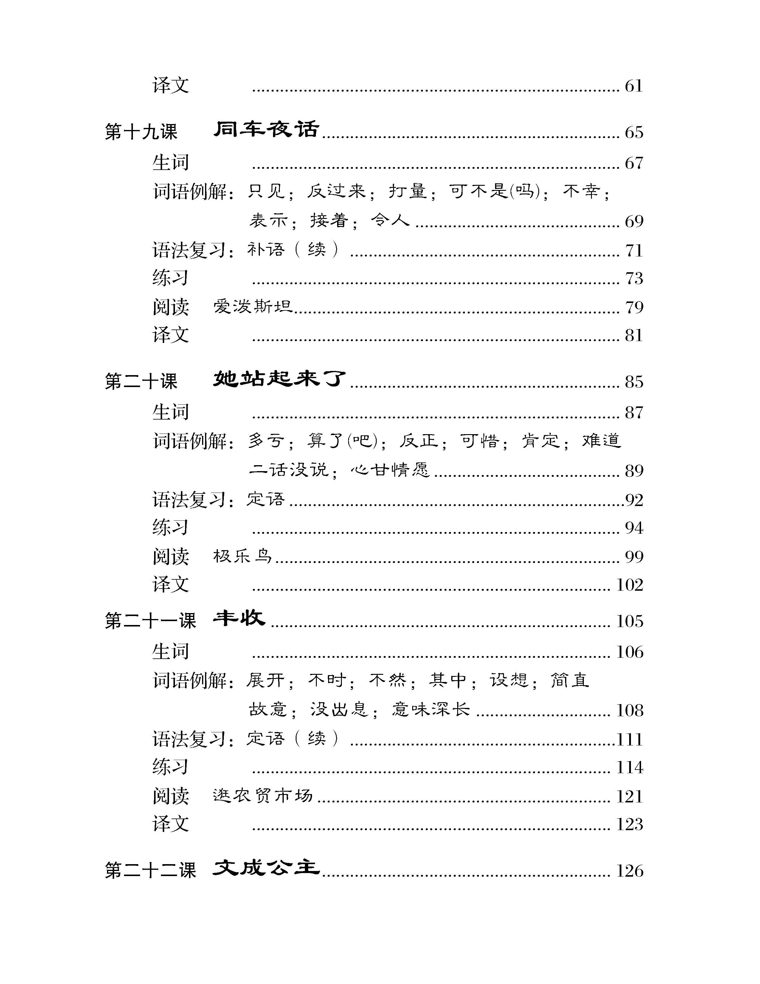 Ngoài ra, để giúp người học củng cố, bổ sung và hệ thống lại các nội dung ngữ pháp đã học trong chương trình sơ trung cấp, khi biên dịch tài liệu này, chúng tôi soạn thêm phần “Ôn tập ngữ pháp” theo hình thức tiểu kết sau mỗi bài. Để người học có thể đối chiếu bài làm, bài dịch của mình, chúng tôi có bổ sung thêm ở cuối sách phần “Đáp án bài tập” và “Bản dịch các bài đọc”. Sách còn có “Bảng từ vựng”, “Bảng danh từ riêng”, “Bảng từ ngữ được giải thích” giúp người học thuận lợi hơn trong việc tra cứu.
