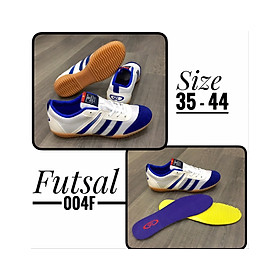 Giày đá bóng futsal mới màu xanh quân đôi cho độ bám sàn tốt cũng như có độ bền cùng độ dẻo dai cao, là chọn lựa lý tưởng của những bạn nam yêu thích thể thao. Đặc biệt, thiết kế chủ đạo màu chuối nổi bật bắt mắt cùng logo ấn tượng, làm toát lên phong cách mạnh mẽ của cầu thủ bóng đá.   Thân giày đá banh Futsal được làm từ vải da PU cao cấp, bề mặt được may nhiều đường chỉ tỉ mỉ tăng độ bềnh cho đôi giày futsal này lên rất cao. Màu trắng và xanh quân đội chủ đạo điểm xuyết là các đường sọc mạnh mẽ màu vàng xanh nổi bật vô cùng thời trang.     Đế giày được thiết kế bằng cao su thiên nhiên và được may toàn bộ đế nên rất chắc chắn, thích ứng với sân cỏ và sân trong nhà. Giày thiết kế dành riêng cho bề mặt sân cỏ nhân tạo và sân futsal với các đường rảnh vừa phải, tránh trơn trượt ngay cả khi bạn chạy trên sân cỏ nhân tạo và sân gỗ bóng futsal đồng thời hỗ trợ tuyệt vời cho những pha xử lý bóng bằng gầm giày, những cú ngoặt bóng siêu nhanh.