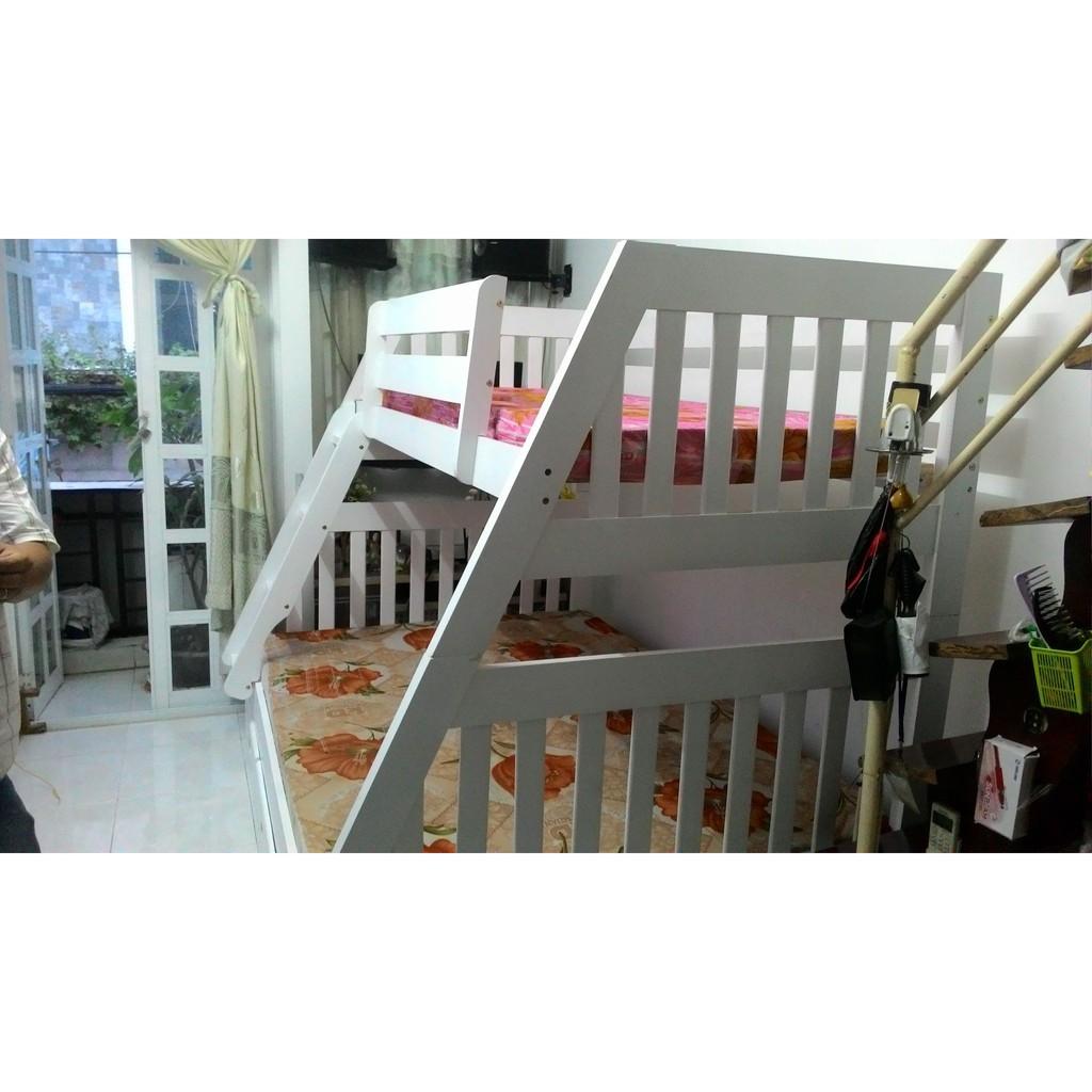 + Chất liệu: Khung giường gỗ thông Newzealand, phân tầng, Vách, đáy hộc gỗ công nghiệp, thang giường MDF chịu lực + Kích thước: kích thước phủ bì, tầng trên ưới 1mx2m Giường tầng hộp