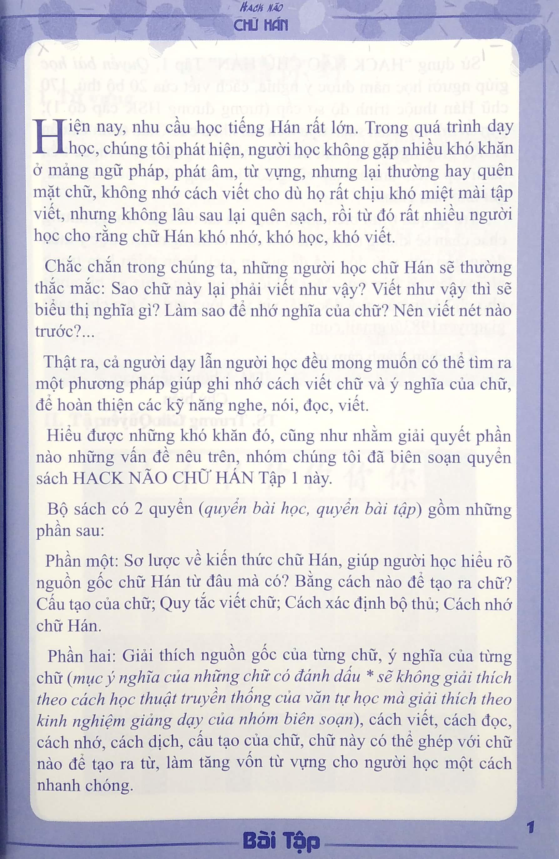 Sử dụng “HACK NÃO CHỮ HÁN” Quyển bài học giúp người học nắm được ý nghĩa, cách viết của 20 bộ thủ, 170 chữ Hán thuộc trình độ sơ cấp ( tương đương HSK cấp độ 1); Quyển bài tập biên soạn dựa trên bài khóa của Giáo trình Chuẩn HSK1 giúp người đọc học sau khi đọc hiểu ý nghĩa của chữ, sẽ tiến hành tập viết, làm bài tập củng cố khả năng nhận biết mặt chữ, ghi nhớ chữ Hán.