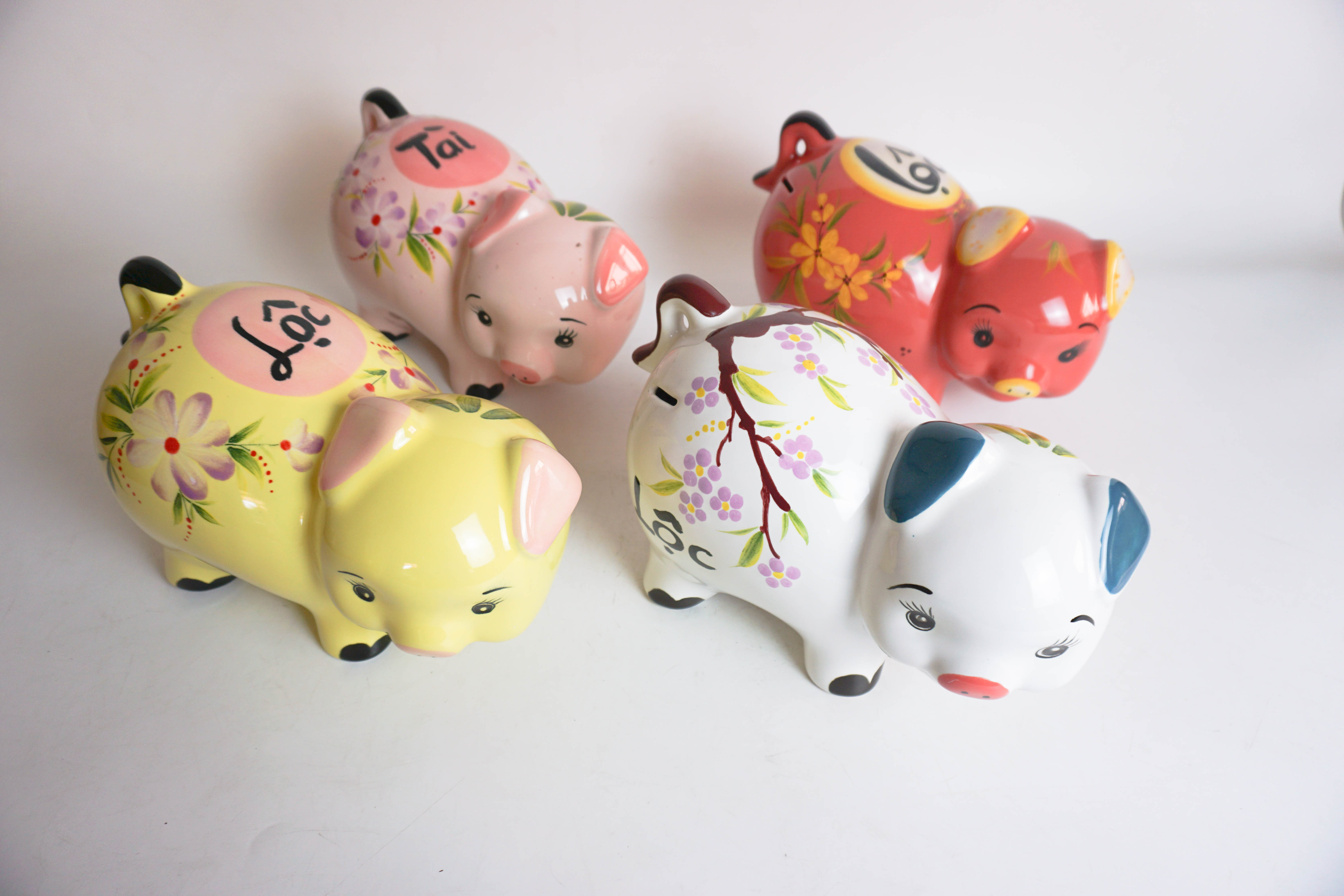 Heo để tiền 04 được làm từ chất liệu sứ cao cấp, ưu điểm có bề mặt mịn màng và được trang trí bắt mắt cho dịp Tết 2024.
