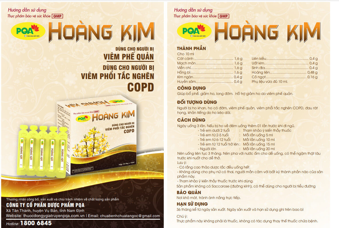 PQA Hoàng Kim dùng cho người bị ho khan, ho có đờm, viêm phế quản, viêm phổi tắc nghẽn mạn tính COPD