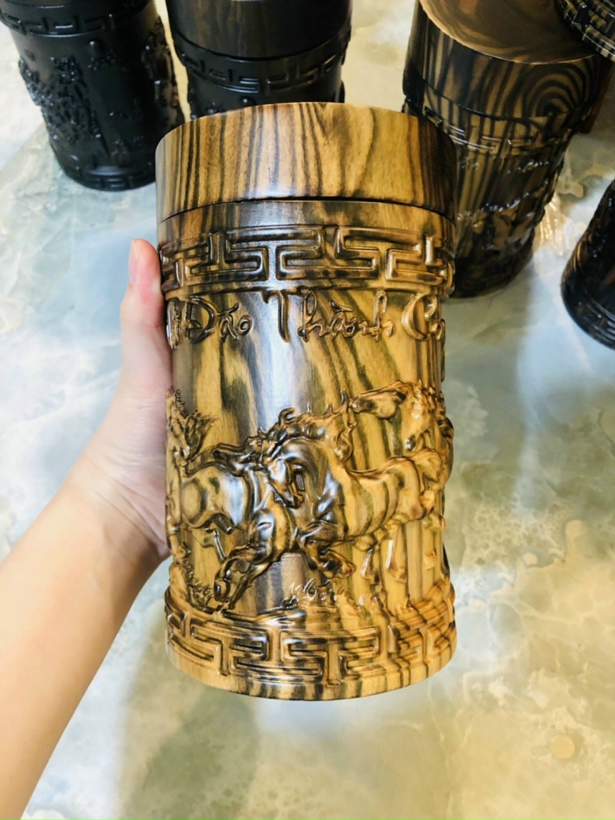 _ Hộp được trà chè được làm bằng chất liệu gỗ mun hoa tự nhiên 100% _ Kt cao 20 thân tròn 11cm _ Hộp đựng trà chè được tiện khắc phân phúc từ đầu