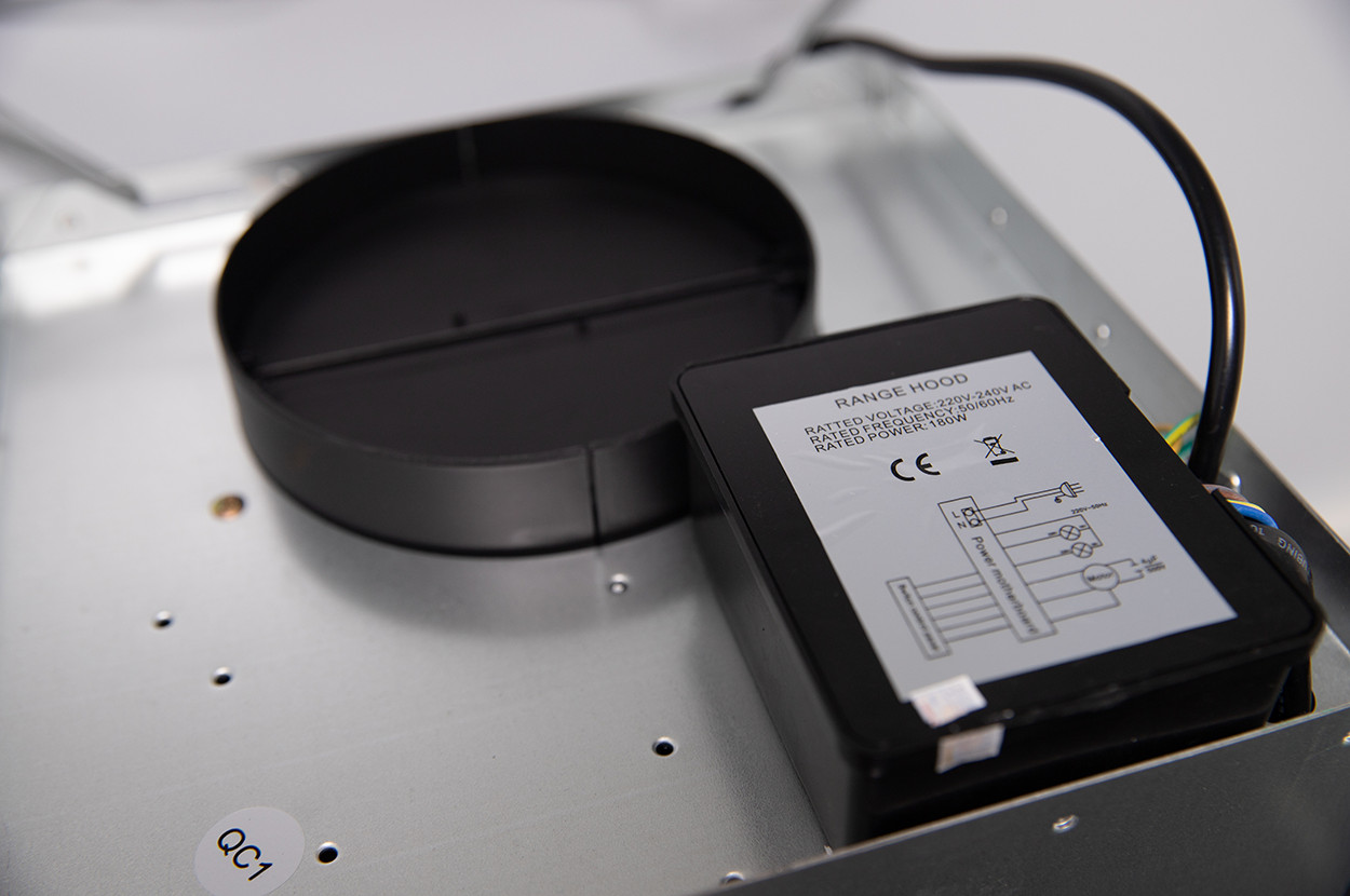 Chất liệu Inox - kính 6mm Điều khiển bằng phím cảm ứng Đèn báo sáng đang hoạt động Ống thoát Ø150mm Đèn Led tiết kiệm điện: 2Wx2 Bộ lọc 1 than hoạt tính và 2