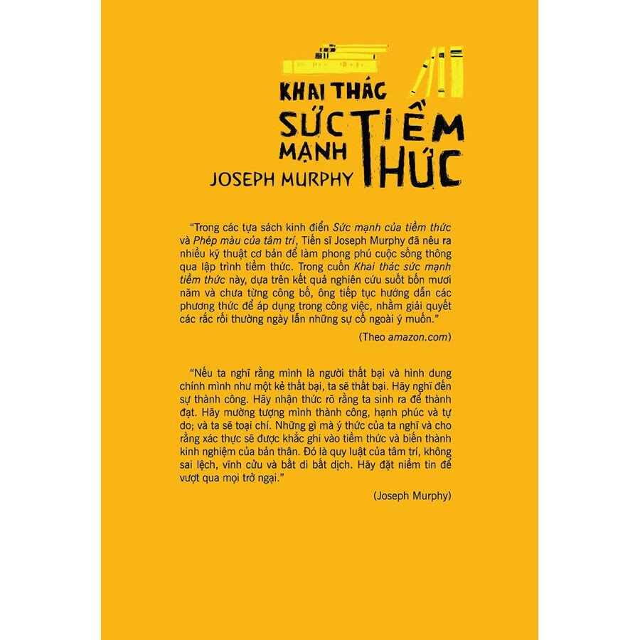 Trong hơn 30 tựa sách đã được xuất bản, Khai Thác Sức Mạnh Tiềm Thức là cuốn sách bán chạy nhất của tiến sĩ Joseph Murphy, được dịch ra rất nhiều thứ tiếng và chinh phục hàng triệu độc giả trên toàn thế giới. Tác phẩm tuyệt vời này giới thiệu đến mỗi chúng ta thứ “vũ khí bí mật” có sức mạnh chi phối cả cuộc đời: Tiềm thức của chính chúng ta. Quan trọng hơn, cuốn sách còn hướng dẫn chúng ta cách sử dụng thứ vũ khí lợi hại đó. Từng bước từng bước một, nhẹ nhàng, đơn giản, dễ hiểu, Joseph Murphy giúp độc giả nhận ra vai trò tối thượng của tiềm thức, từ từ làm chủ tư duy của mình để thoát khỏi những ám thị tiêu cực, trở nên một người xác lập được giá trị bản thân, biết trân trọng người khác, từ đó giao tiếp hiệu quả, thành công và không ngừng thăng tiến trong sự nghiệp cũng như trong cuộc sống.
