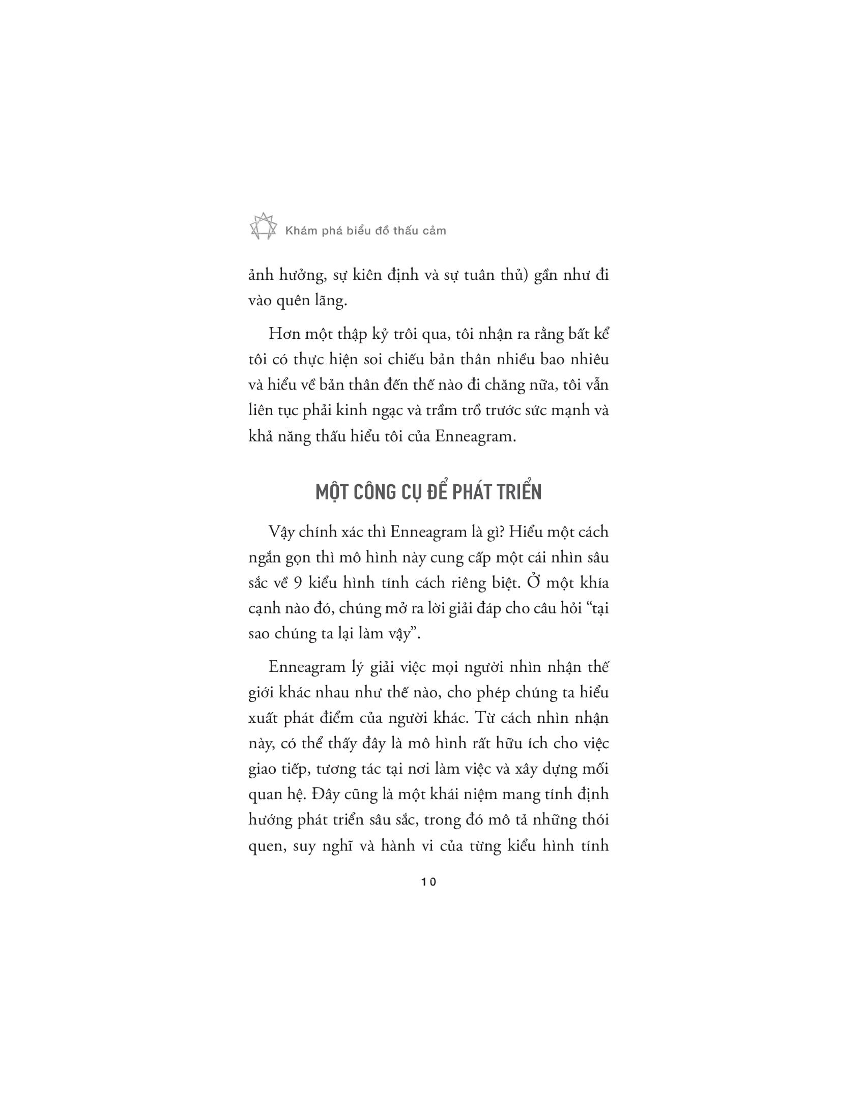 ‘Khám phá biểu đồ thấu cảm’ là cuốn sách giúp bạn hiểu sâu hơn về bản thân và từng bước tiến tới thành công trong cuộc sống. Cuốn sách khai thác mô hình Enneagram - mô hình tâm lý phổ biến, phân chia con người thành 9 kiểu hình tính cách khác nhau. Mỗi kiểu hình đại diện cho những đặc trưng và động lực riêng, giúp bạn nhận diện m.ình thuộc kiểu nào và cách mà nó ảnh hưởng đến thói quen, sự phát triển và tương tác của bạn trong công việc cũng như trong mối quan hệ.