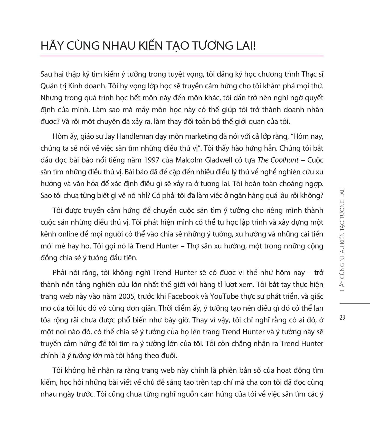 Quyển sách này sẽ cung cấp cho bạn những kỹ thuật mà đội ngũ Trend Hunter đã dùng để giúp nâng cao hiệu suất đổi mới sáng tạo cho các công ty hàng đầu thế giới như Starbucks, American Express, IBM, Adidas, Google và NASA.