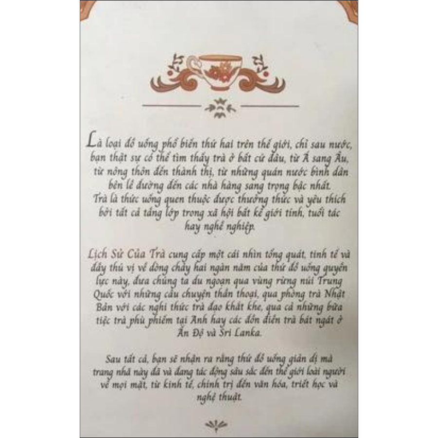 LỊCH SỬ CỦA TRÀ cung cấp một cái nhìn tổng quát, tinh tế và đầy thú vị về dòng chảy hai ngàn năm của thứ đồ uống quyền lực này, đưa chúng ta du ngoạn qua vùng rừng núi Trung Quốc với những câu chuyện thần thoại, qua phòng trà Nhật Bản với các nghi thức trà đạo khắt khe, qua cả những bữa tiệc trà phù phiếm tại Anh hay các đồn điền trà bát ngát ở Ấn Độ và Sri Lanka.