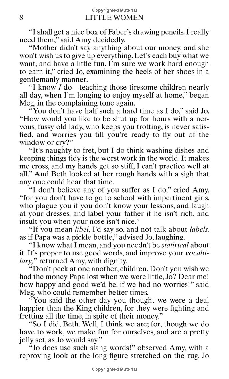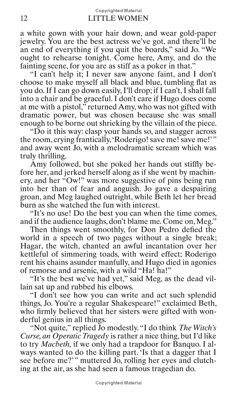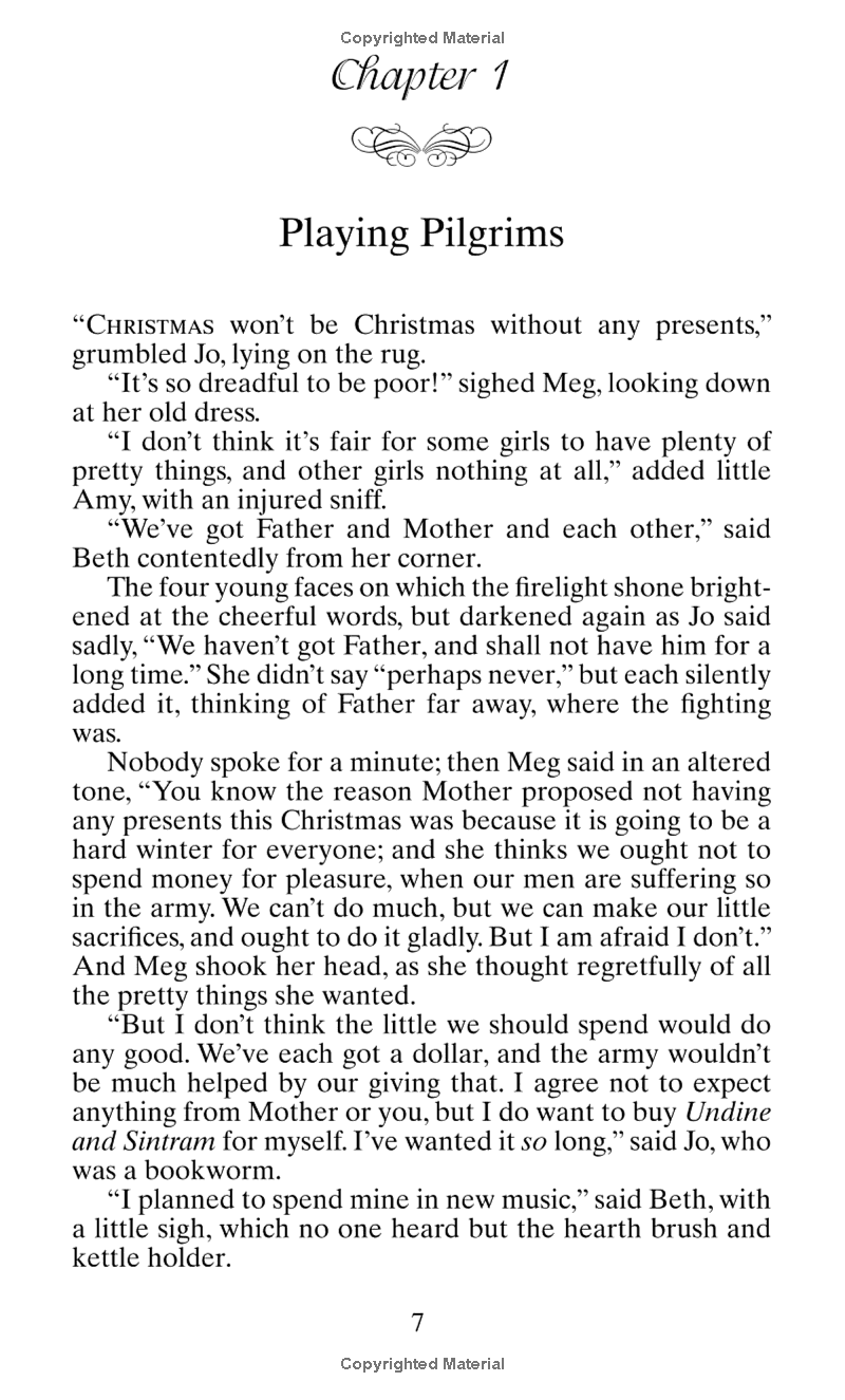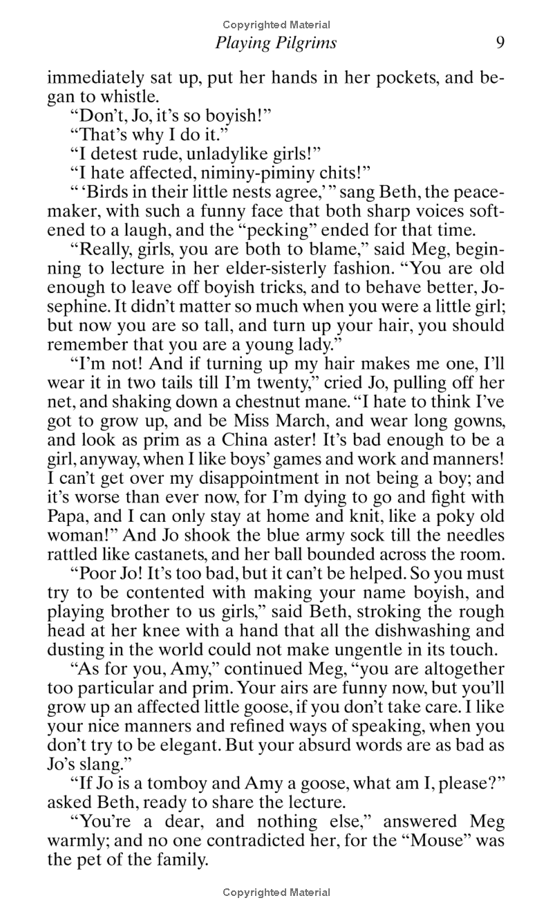 The four March sisters--Meg, Amy, Beth, and feisty Jo--share the joys and sorrows of growing up while their father is away at war. The family is poor in worldly goods, but rich in love and