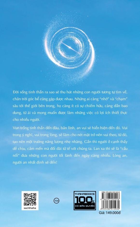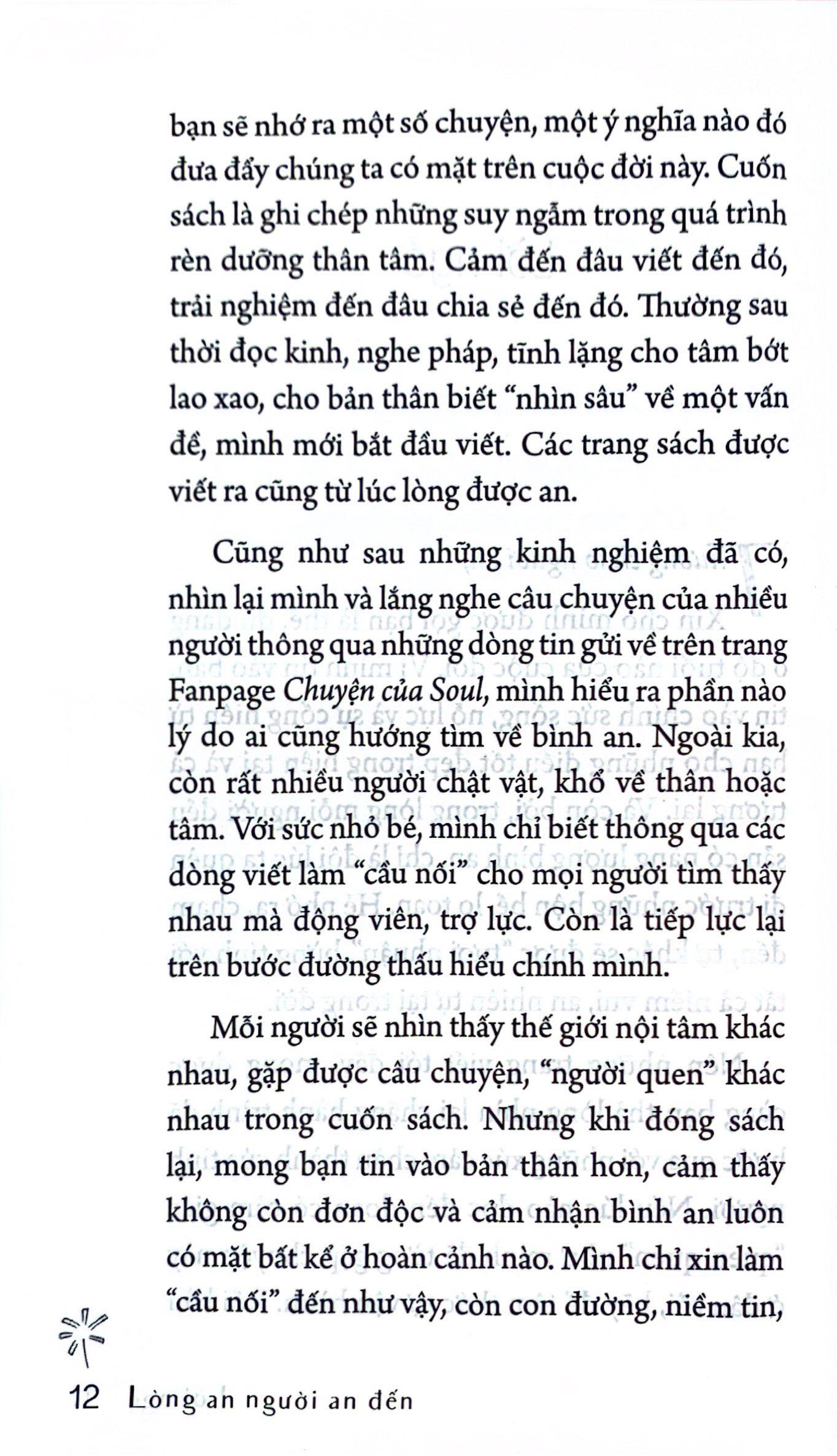 Mua tại TiktokLòng An - Người An Đến Nên những trang viết từ “Lòng an người an đến”, mong được cùng bạn thả lòng nhìn lại chặng hành trình đã bước qua với những xúc cảm chân thành của tình người. Nếu lúc nào đọc đến đoạn có cảm giác “quen quen” như m.ình đã từng gặp chuyện này ở đâu rồi, hãy để tâm thức tự vận hành. Rồi hẳn bạn sẽ nhớ ra một số chuyện, một ý nghĩa nào đó đưa đẩy chúng ta có mặt trên cuộc đời này. Cuốn sách là ghi chép những suy ngẫm trong quá trình rèn dưỡng thân tâm. Cảm đến đâu viết đến đó, trải nghiệm đến đâu chia sẻ đến đó. Thường sau thời đọc kinh, nghe pháp, tĩnh lặng cho tâm bớt lao xao, cho bản thân biết “nhìn sâu” về một vấn đề, m.ình mới bắt đầu viết. Các trang sách được viết ra cũng từ lúc lòng được an. Cũng như sau những kinh nghiệm đã có, nhìn lại m.ình và lắng nghe câu chuyện của nhiều người thông qua những dòng tin gửi về trên trang Fanpage Chuyện của Soul, m.ình hiểu ra phần nào lý do ai cũng hướng tìm về bình an. Ngoài kia, còn rất nhiều người chật vật, khổ về thân hoặc tâm. Với sức nhỏ bé, m.ình chỉ biết thông qua các dòng viết làm “cầu nối” cho mọi người tìm thấy nhau mà động viên, trợ lực. Đời sống tinh thần ra sao sẽ thu hút những con người tương tự tìm về, chân trời góc bể cũng gặp được nhau. Những ai càng “nhớ” và “chạm” sâu tới thế giới bên trong, họ càng ít có sự chiếm hữu, càng dần bao dung, từ ái và mong muốn được làm những việc có lợi ích thiết thực cho nhiều người. Vun trồng tinh thần đến đâu, bản lĩnh, an vui sẽ hiển hiện đến đó. Vui trong ý nghĩ, vui trong lòng, sẽ làm cho nét mặt trở nên vui theo, từ đó, tạo nên một trường năng lượng nhẹ nhàng. Gần thì người ở cạnh thấy dễ chịu, cảm mến mà đối đãi tử tế với chúng ta. Lan xa thì sẽ là “cầu nối” đưa những con người tốt lành đến ngày càng nhiều. Lòng an, người an nhất định sẽ đến! Nhẹ nhàng tốt, nhẹ nhàng thương! Nhẹ nhàng mỉm cười, nhẹ nhàng an! Nhẹ nhàng gặp gỡ, nhẹ nhàng chia xa. Người cần đi nhất định sẽ đi. Người cần đến nhất định sẽ đến! Đời này vẫn đẹp là vì, có một số đoạn duyên phải ngừng, số khác lại nảy nở. Tùy ngộ mà an, tùy duyên mà sống! Tác giả: Soul (Tánh Pháp) là một tác giả Việt, anh cũng là người sáng lập trang fanpage Chuyện của Soul trên ok. – Sách đã xuất bản: