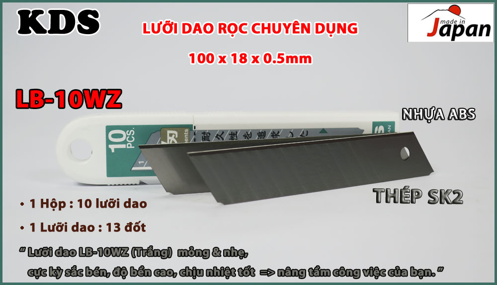 LƯỠI DAO 18mm KDS LB-10WZ THÔNG SỐ KỸ THUẬT: - Chất liệu: Thép SK2 - Kích thước lưỡi dao: 100 x 18 x 0,5 mm. - Kích thước đóng gói: 13cm x 2.5cm x