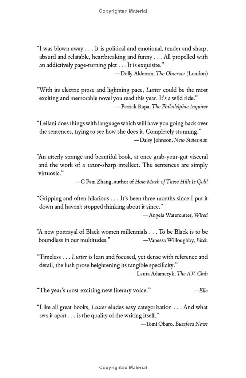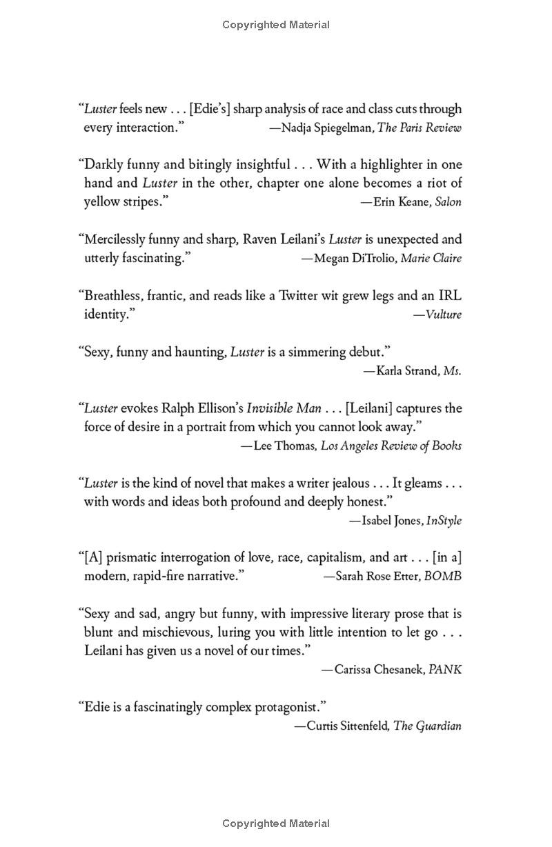 Irresistibly unruly and strikingly beautiful, razor-sharp and slyly comic, sexually charged and utterly absorbing, Raven Leilani’s Luster is a portrait of a young woman trying to make sense of her life―her hunger, her anger―in a tumultuous era. It is also a haunting, aching description of how hard it is to believe in your own talent, and the unexpected influences that bring us into ourselves along the way.